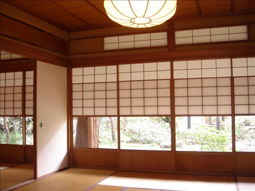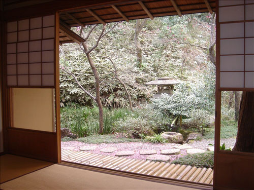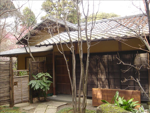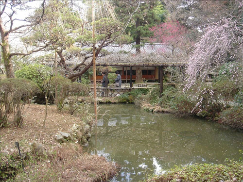 - 茅葺屋根の松連庵、本格的な茶室三檪庵の建物を中心に心字池と庭園がある。