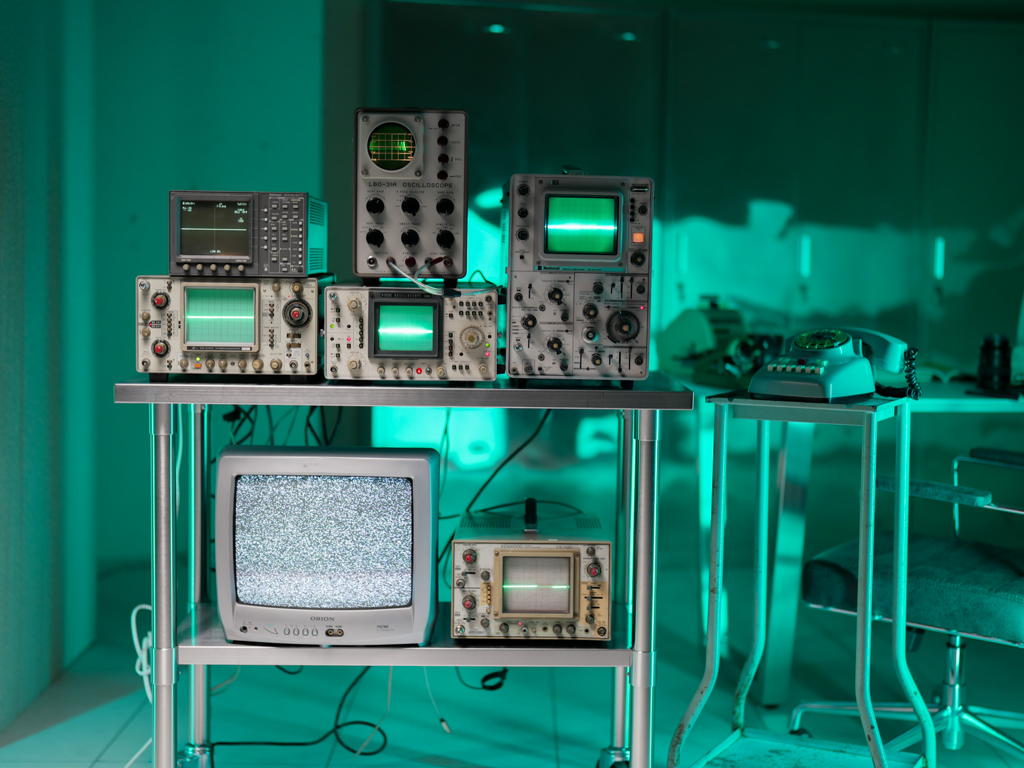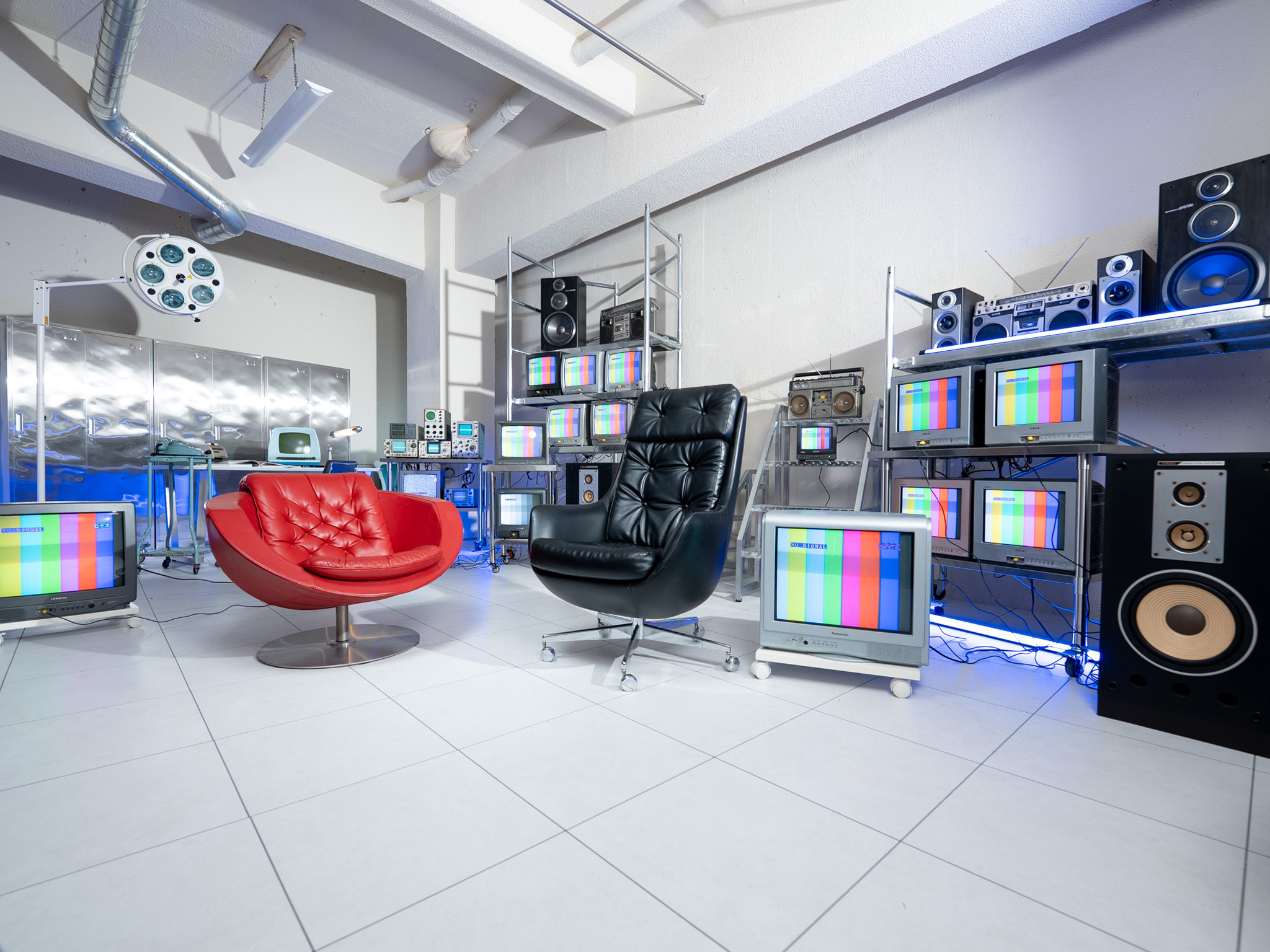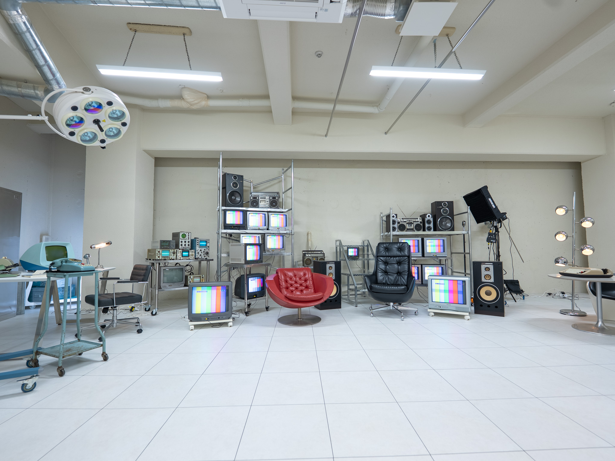 ブラウン管テレビやオシロスコープ、ヴィンテージ映像機器を配置。特に15台以上のブラウン管テレビを使った背景演出は、このスタジオならではの象徴的なセットです。