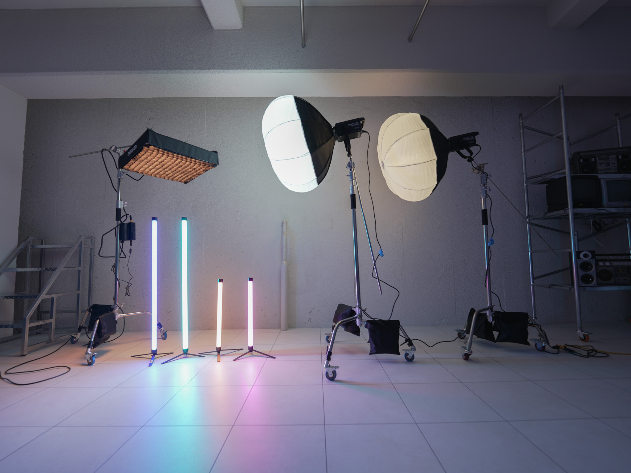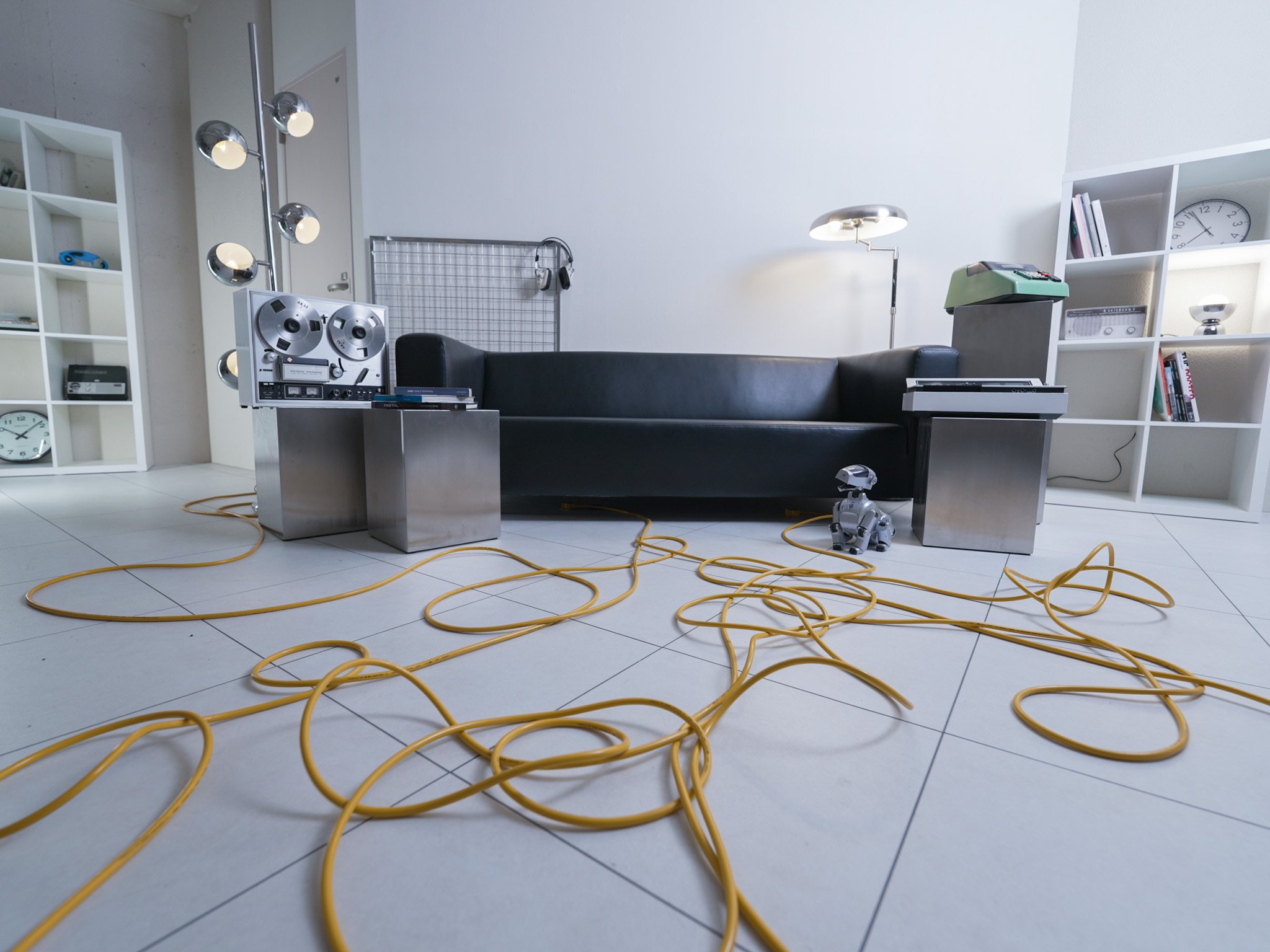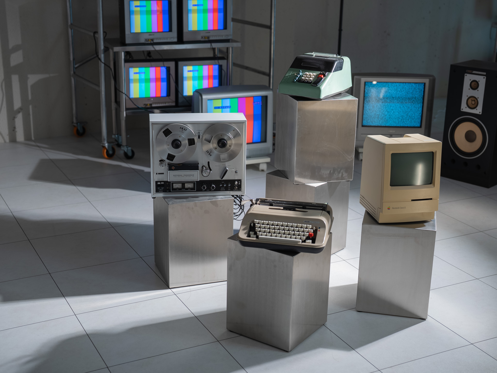 ブラウン管テレビやオシロスコープ、ヴィンテージ映像機器を配置。特に15台以上のブラウン管テレビを使った背景演出は、このスタジオならではの象徴的なセットです。