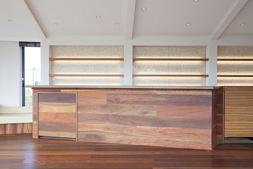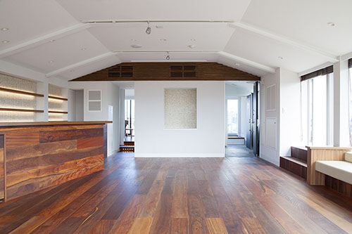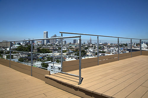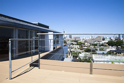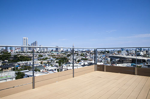 北側・東側2つのウッドデッキ調のルーフバルコニーの中央に、カフェバーをイメージしたペントハウスを併設しています。