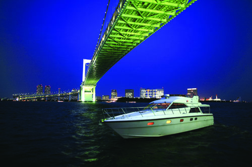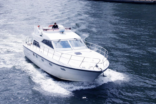 ヨーロピアンタイプのクルーザーです。船内泊ができる設備も整っており、長期ロケにも対応できます。