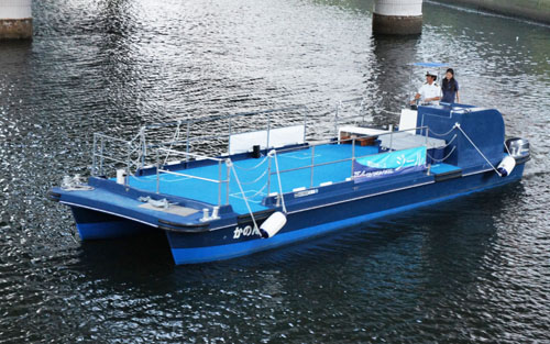 低い橋の下も走れる運河船です。椅子を全てはずして平らな状態で劇船やカメラ船としての使用も可能。トイレ付きなので長時間ロケにも対応できます。スカイツリーの真横を流れる、特殊な船舶しか航行できない「北十間川」も通航できます。フロアが赤色の同型姉妹船「ルーク号」もあります。