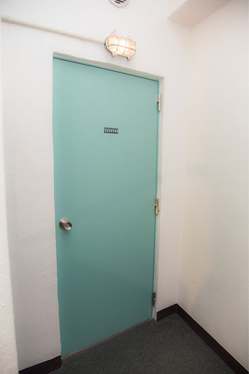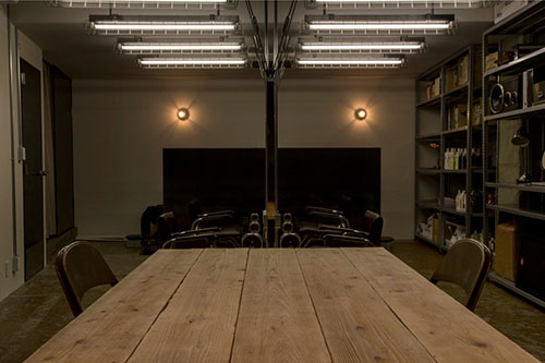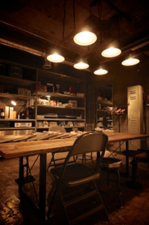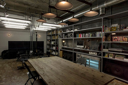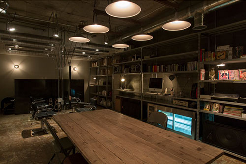壁と床はコンクリート、一枚板の大きなテーブル、壁一面の棚にはアート作品や音響設備が並び、独特の雰囲気がある空間。地下1階ですが天井が高く仕切りがない店内は広々としています。本来のヘアサロンの他に、オフィスや事務所としても利用可能。