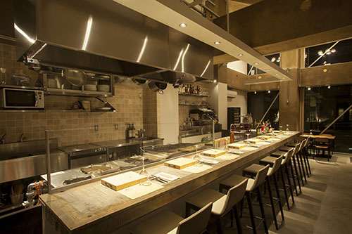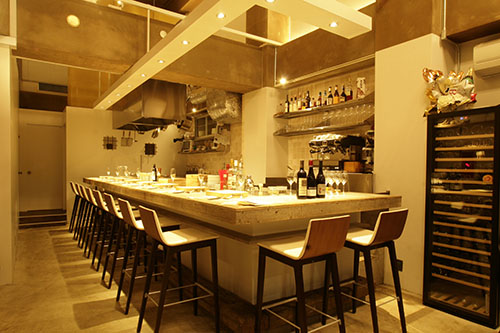 広々としたカウンター席と調理しているところが見えるオープンキッチンが自慢です。夜にはオシャレな照明が店内を照らし、バーのシーンでもご利用いただけます。