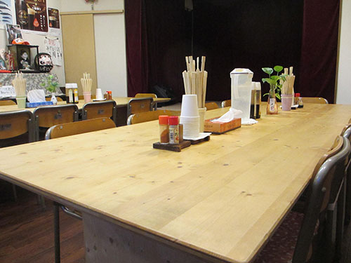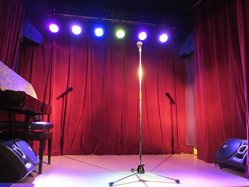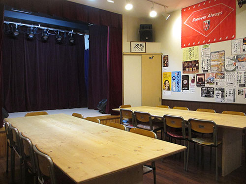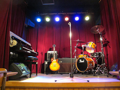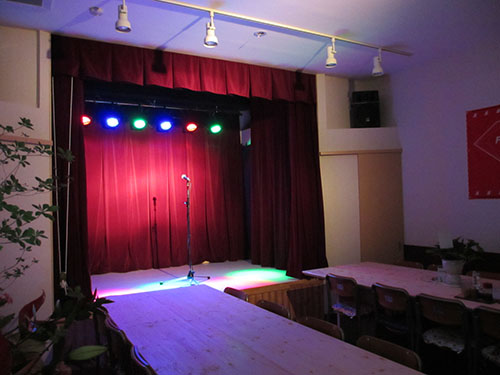 こじんまりとしたお店ですが、そこへ小さいながら本格的な舞台を設えてあります。照明・音響設備は無料で利用可能です。