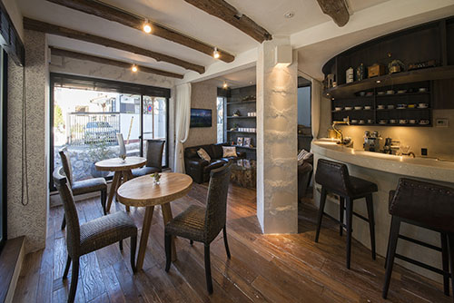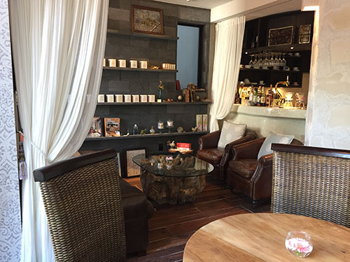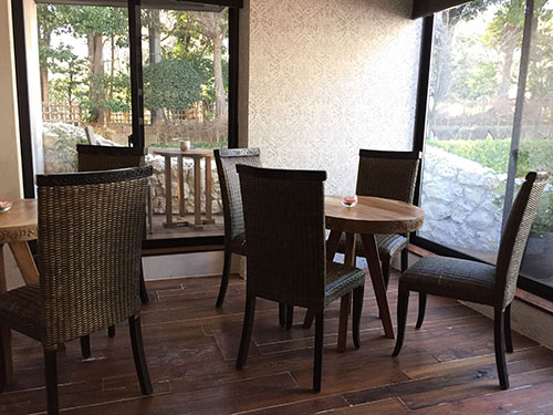 店の前には戸越公園の緑豊かな景色が広がり、店内はヨーロッパのアンティーク雑貨と、バリ島直輸入の天然石・無垢材のインテリア・家具でデザインされたリゾートアンティークな空間です。