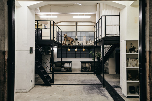 天井高は4.8m。NYのロフトアパートを彷彿とさせる空間には、充実したヴィンテージインテリアが配置され、白壁、シャッター、階段、ロフトからの俯瞰撮影など、さまざまなシチュエーションでの撮影が可能です。