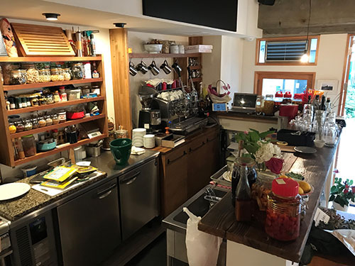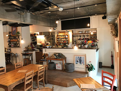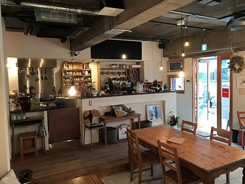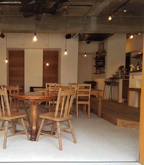 2017年6月にオープンしたカフェです。真四角の店舗にオープンキッチンのレイアウト。店内は白い壁と古材を使い天井はコンクリート打ちっ放しのインテリアです。