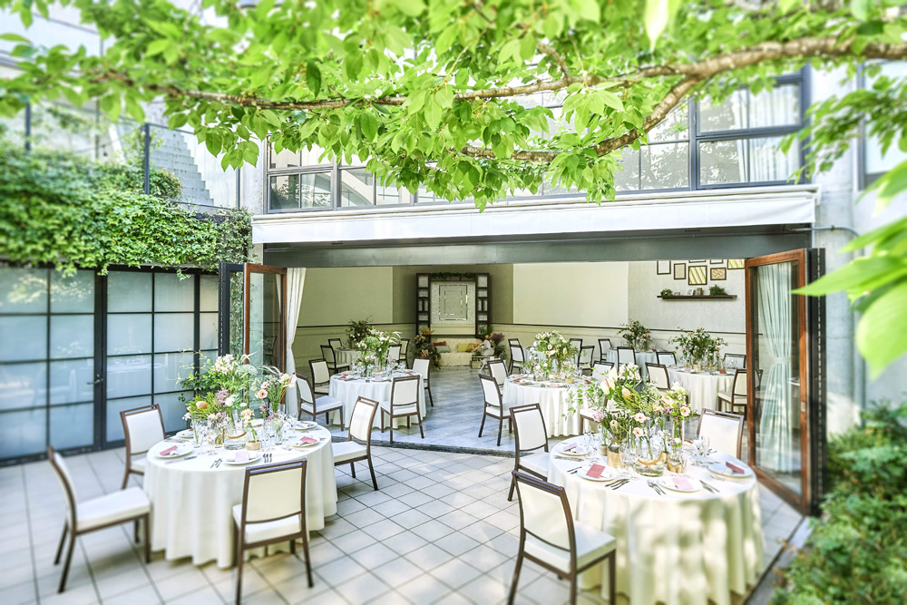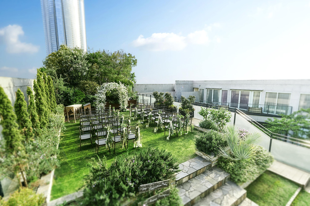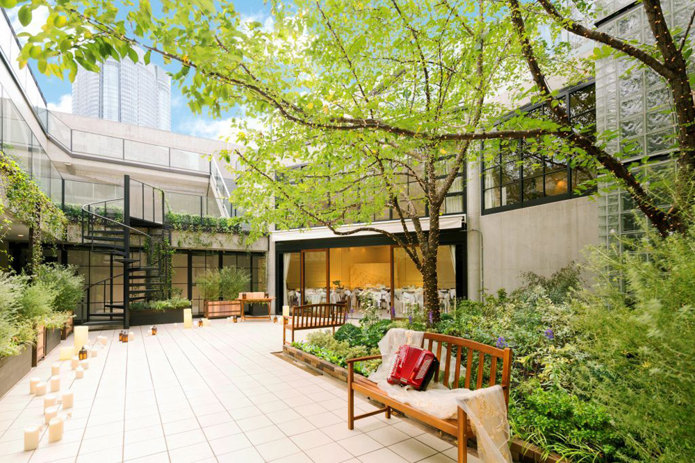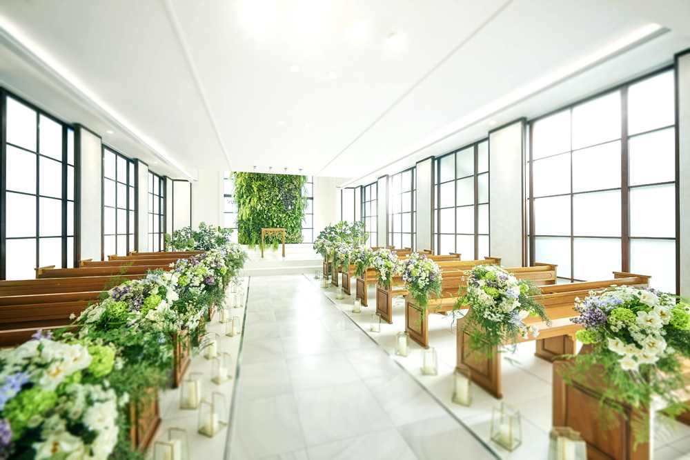 緑に囲まれた中庭、解放感溢れる屋外チャペル、