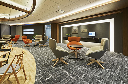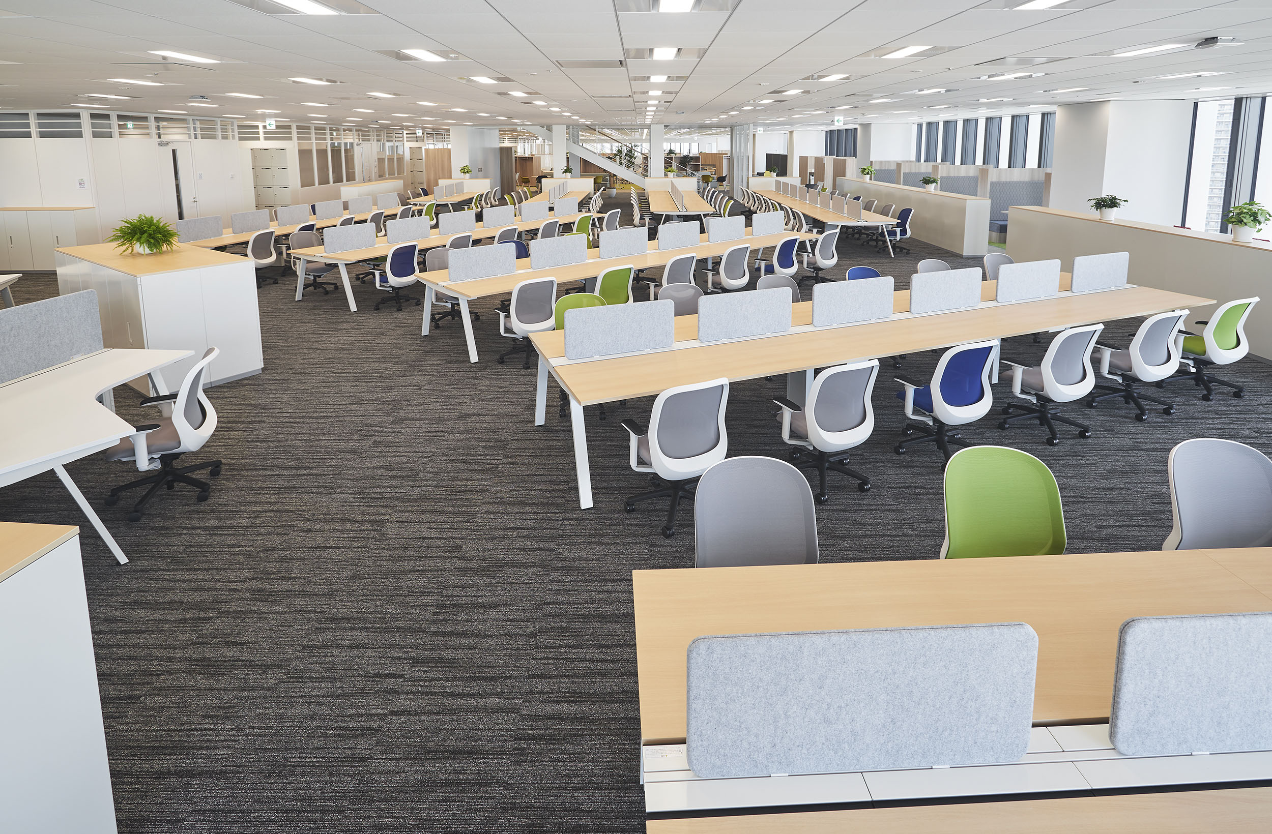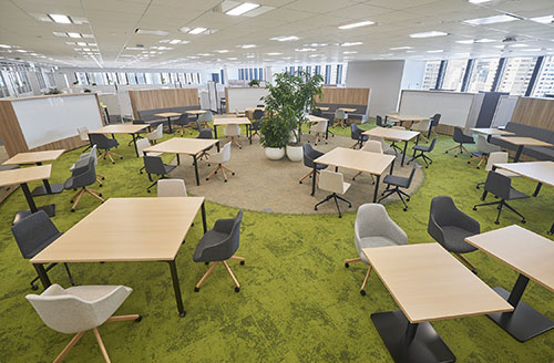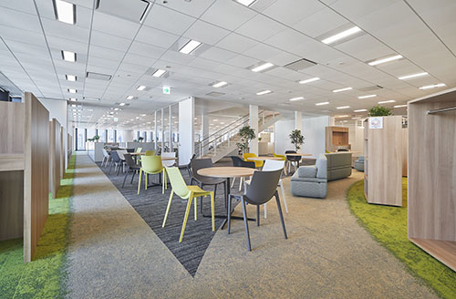 当社は、フリーアドレスのため大変開放感のあるオフィスです。2フロア(18・19F)を使用しておりフロアのほぼ中央に上下フロアを行き来できる階段があります。