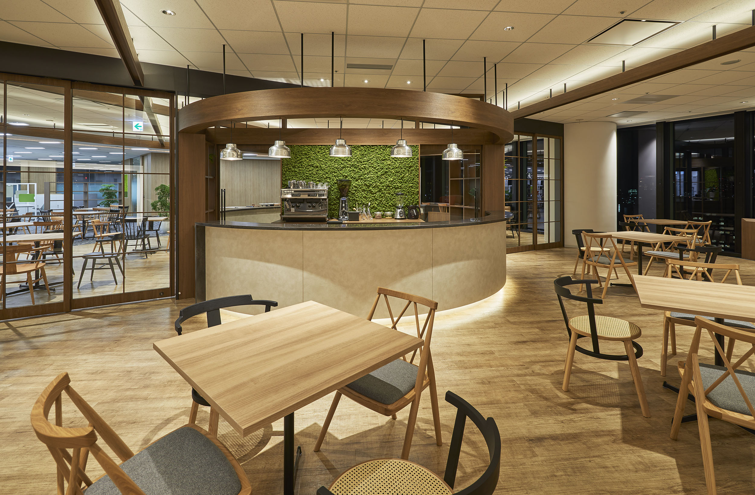 社内カフェをオフィス内に設置しており、木の素材を中心とした設計で他のスペースと異なったオシャレな雰囲気にしております。