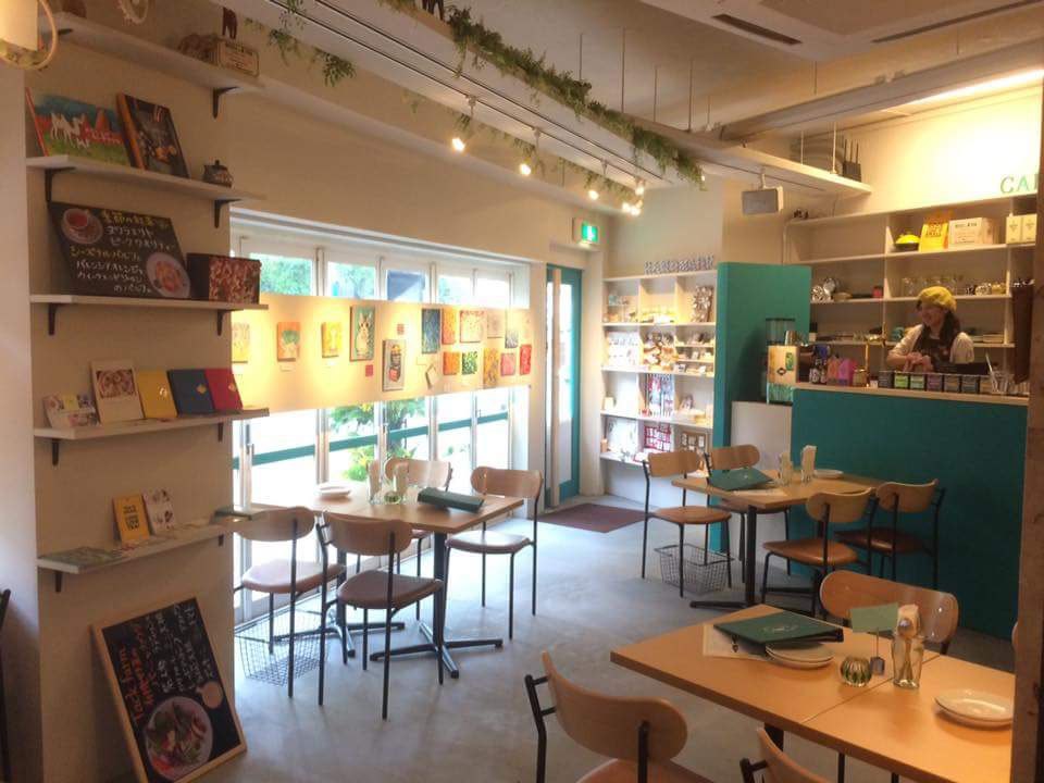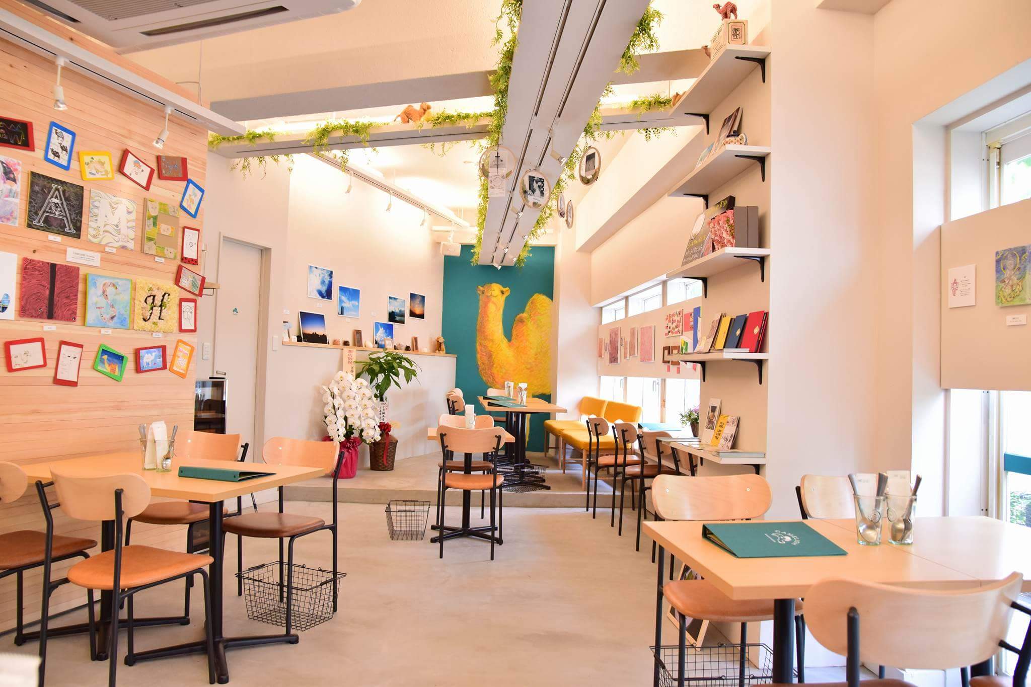 当店は3週間ごとに展示物の変わるギャラリーカフェです。店内は青緑・白・木を基調としていて、大きなラクダのアートがあるのが特徴です。