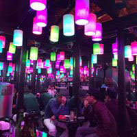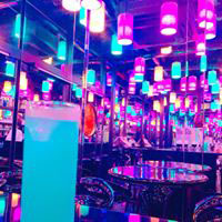 全面鏡張りでライトを50個ほど落としていますのでどこまでもライトが続く幻想的な内装に致しました。ライトの色は普段イルミネーションのように変わっていきますがデジタルLED制御してありますので統一やフラッシュなどどんな形でも対応できます。