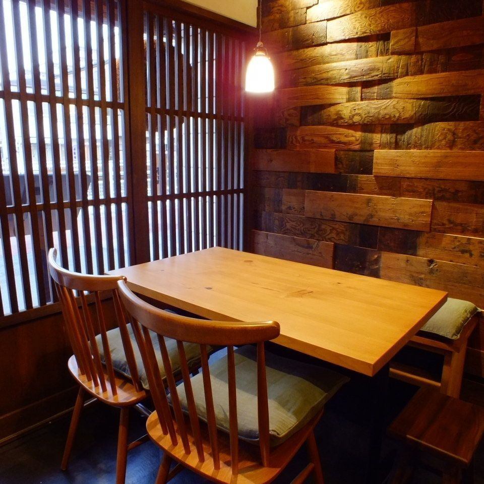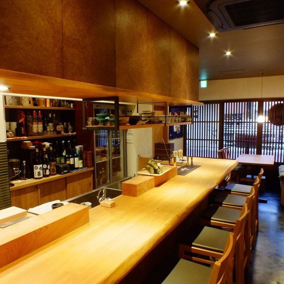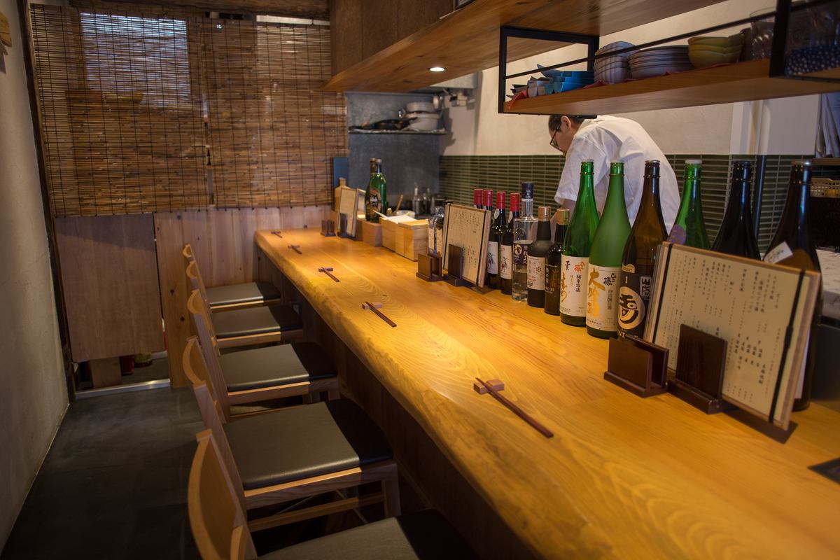 古木、柿の渋皮で染めた和紙、日本酒の木樽など、こだわりの材料を使用した内装のカウンターメインの和食屋です。