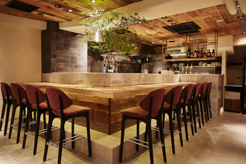 店内は木を中心に大理石や漆喰などの素材をミックスしたナチュラル・モダンなインテリア。