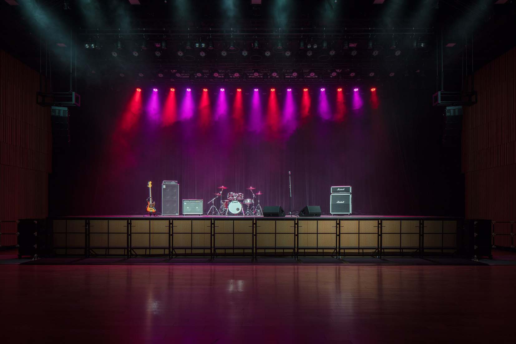 ホール天井にはバトンがあり、LED照明を常設。電源回りも充実。