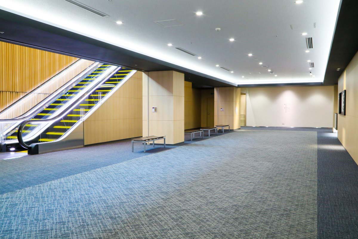 ホワイエ:施設専用エスカレーターを降りると、ホテルのロビーのような広々とした空間が広がります。