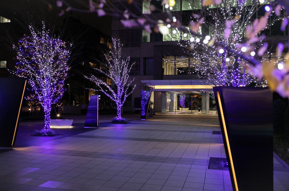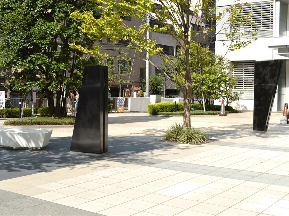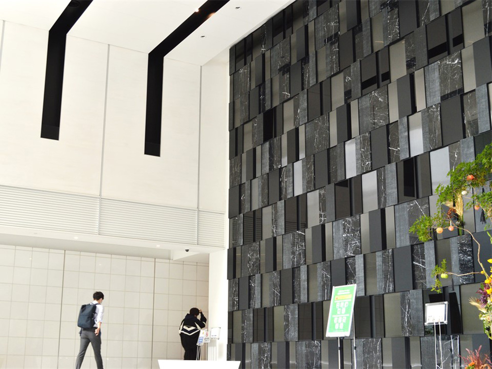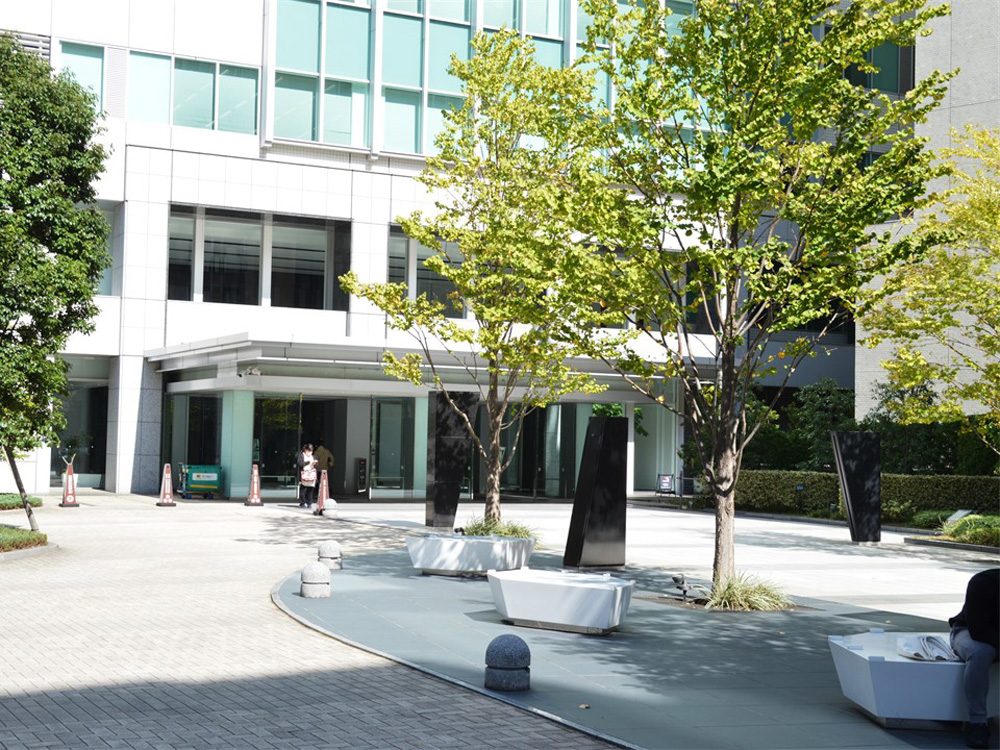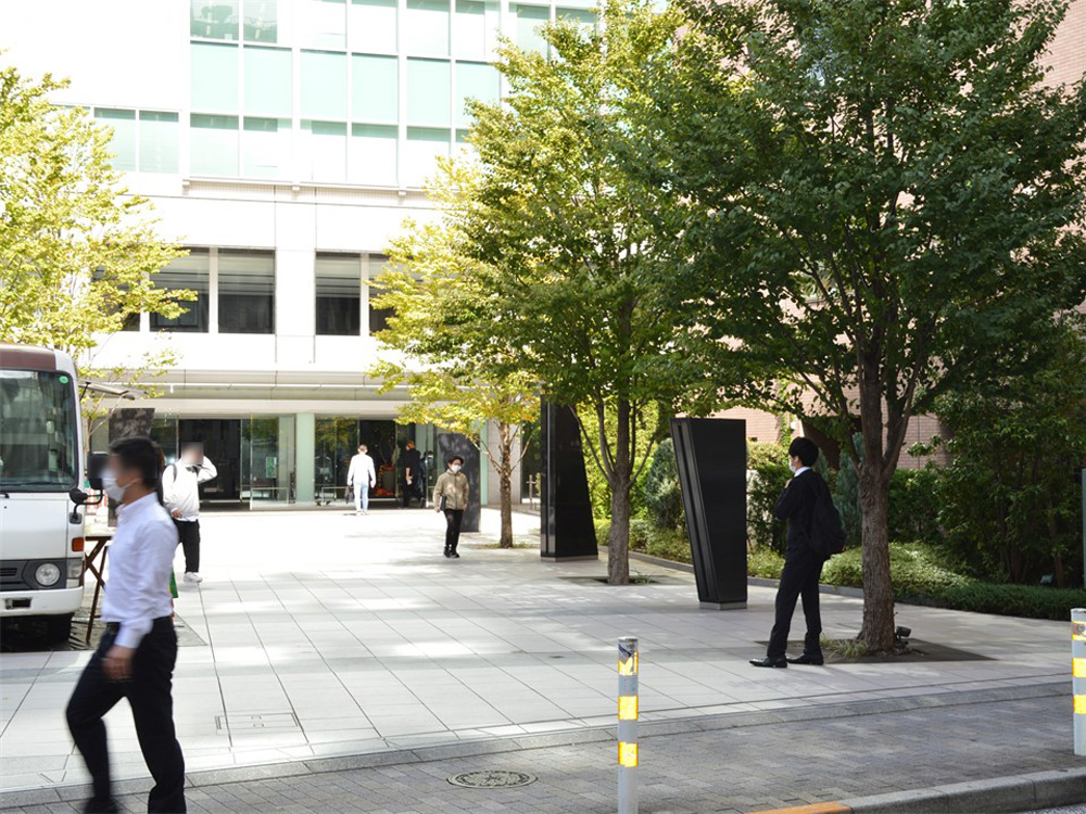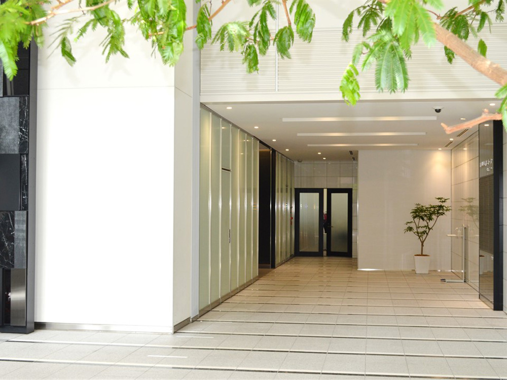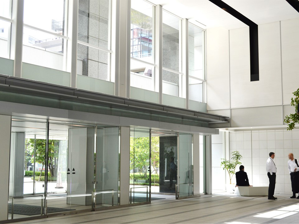 恵比寿にある高層ビル。2層吹抜の開放感あるエントランスホールとビル前の広い広場。