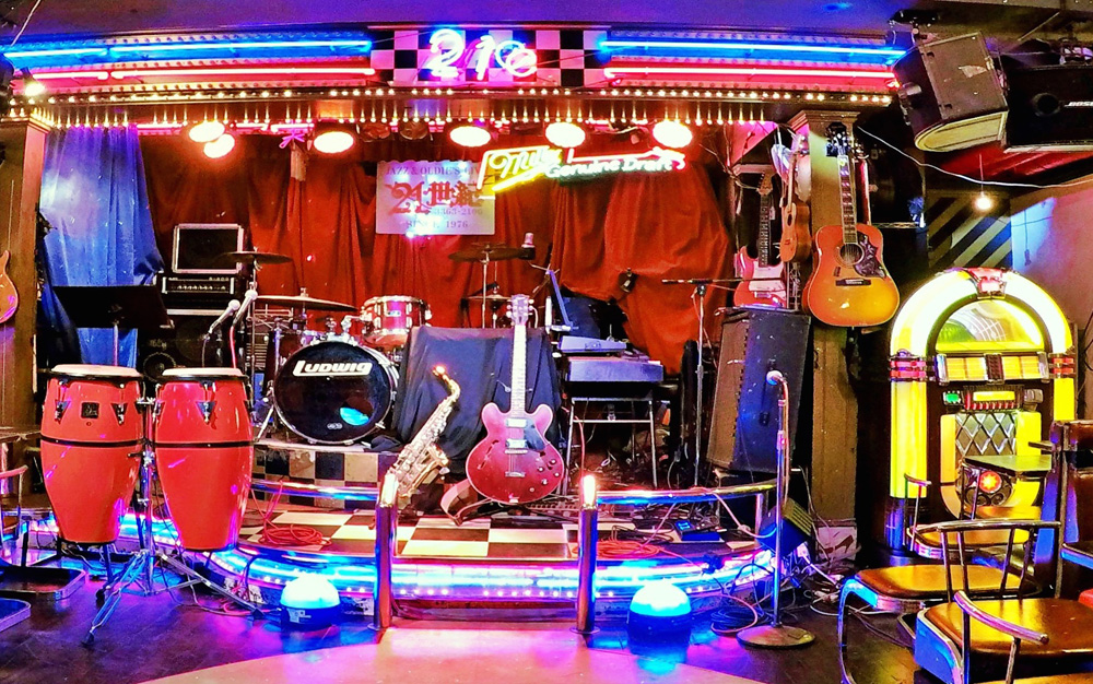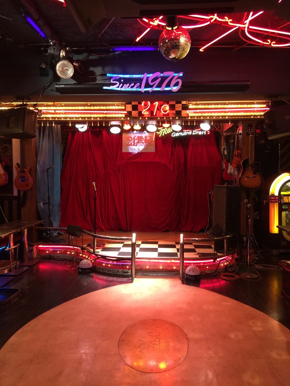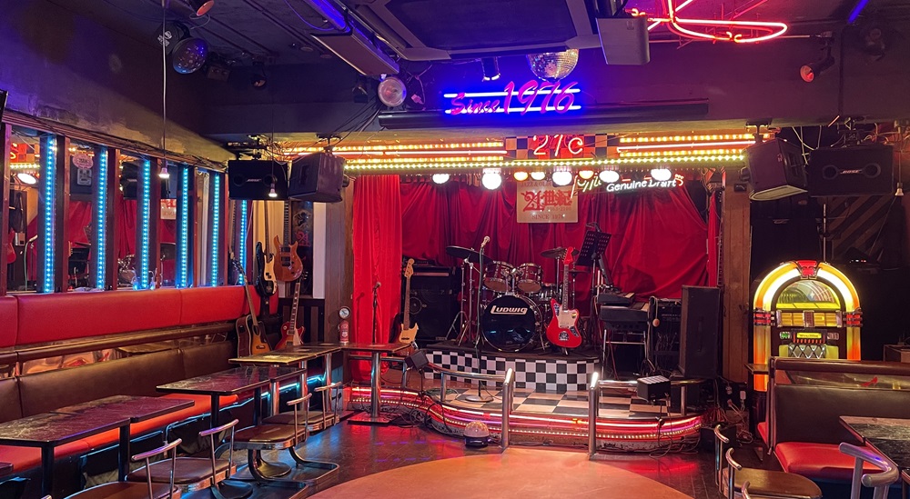 60年代アメリカンスタイルのレトロな雰囲気の東京都内のライブバー(ライブハウス)です。いまは珍しいネオン菅・及び最新のLED機器で照明も多彩。 (懐かしのジュークボックスもあります。) これまでもドラマ撮影・MV撮影・写真撮影など色々なシーンでご利用いただいています。