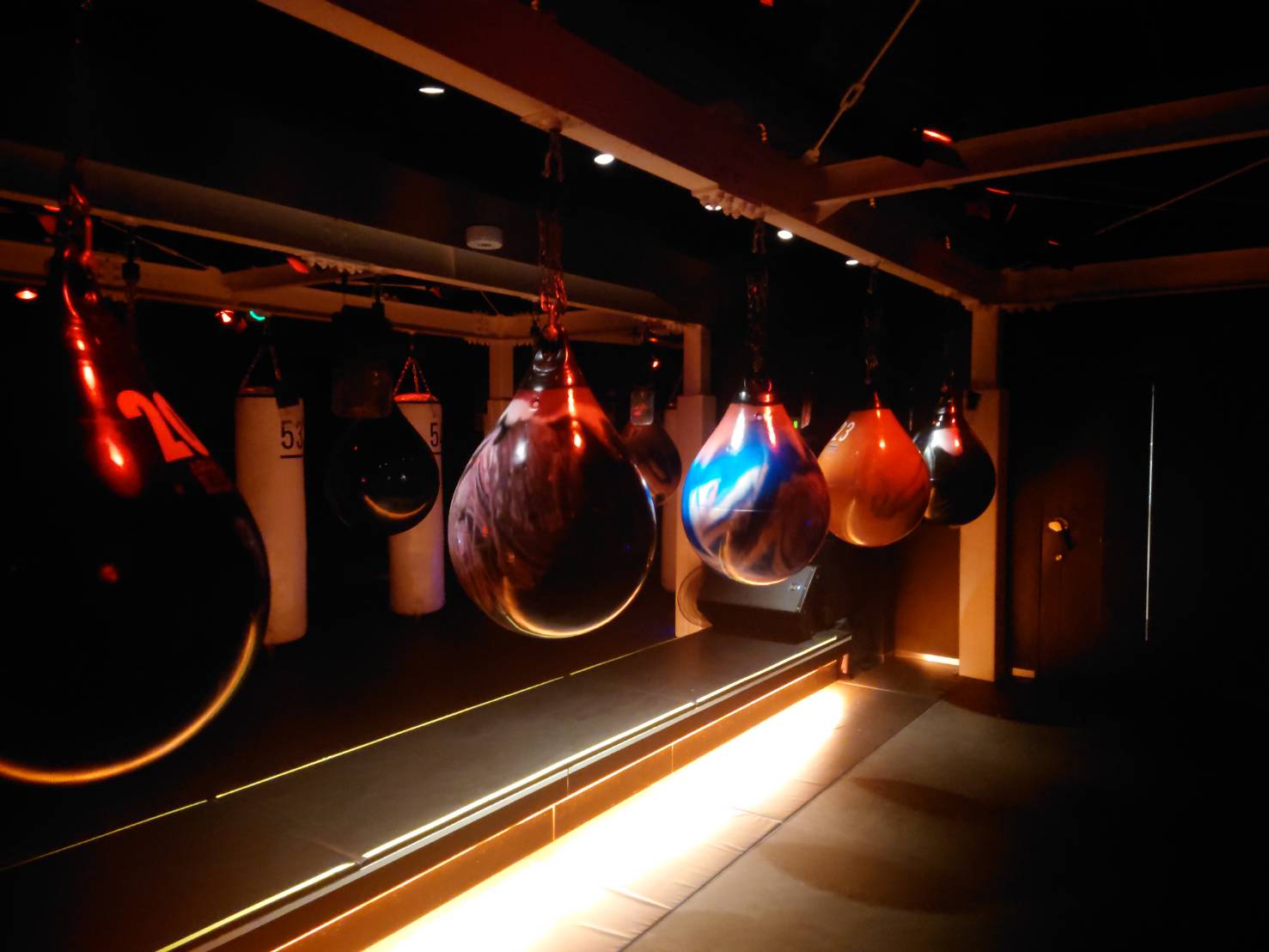 比較的夜中は撮影の時間を取ることができ、防音完備のため大きな音が出せます。テープライトやブラックライトも完備しておりクラブの様な空間の中でサンドバック打ちができます。