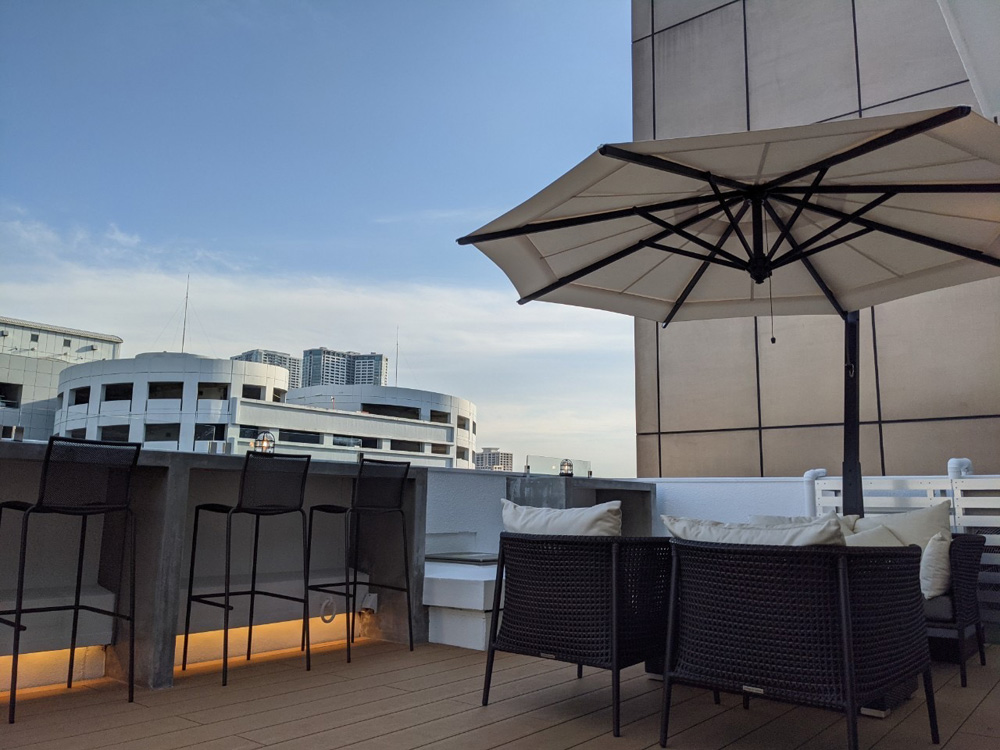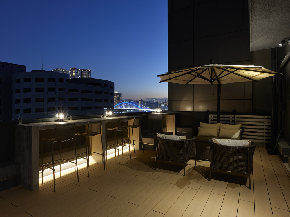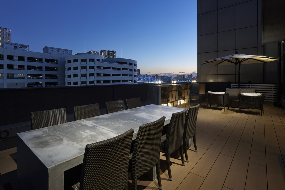 昼間、夕暮れ時、夜と異なる表情を魅せる湾岸エリアを望むオープンテラスには、固定席やカウンター席もあり、様々なシチュエーションを演出できます。