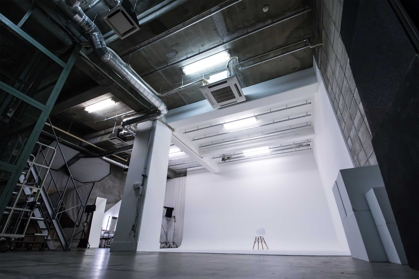 4mの天井高がある白ホリゾントと廃墟風スペースが同居し、同時に2タイプの撮影ができるお得な撮影スタジオ。