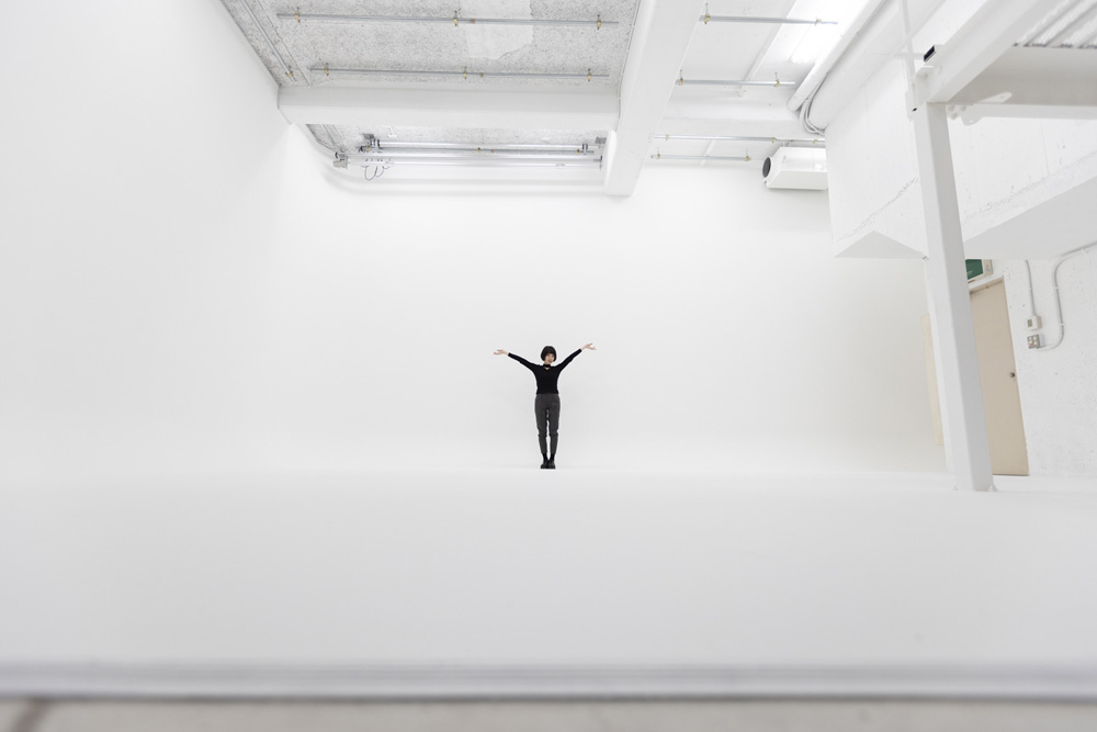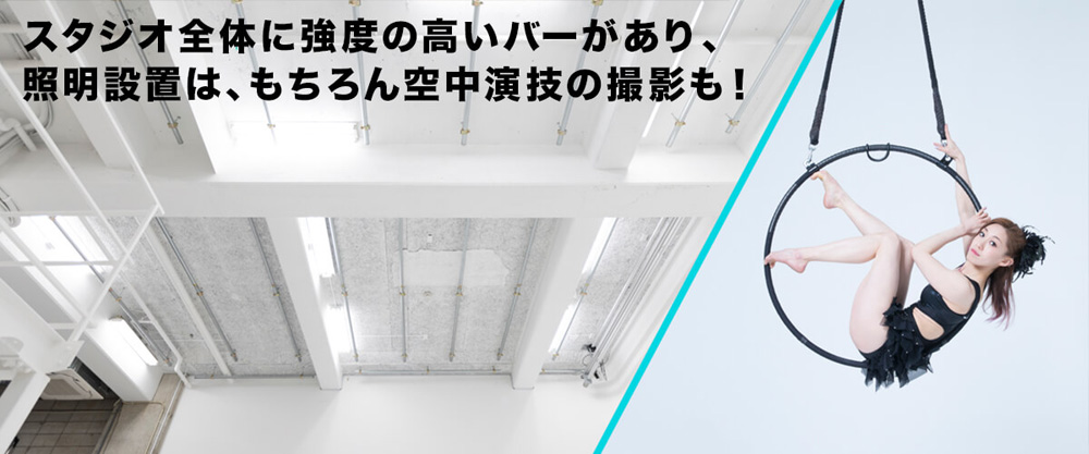 横幅9m、奥行き7.6m、天井高4.8m、室内面責100平米の2面R白ホリゾント撮影スタジオ