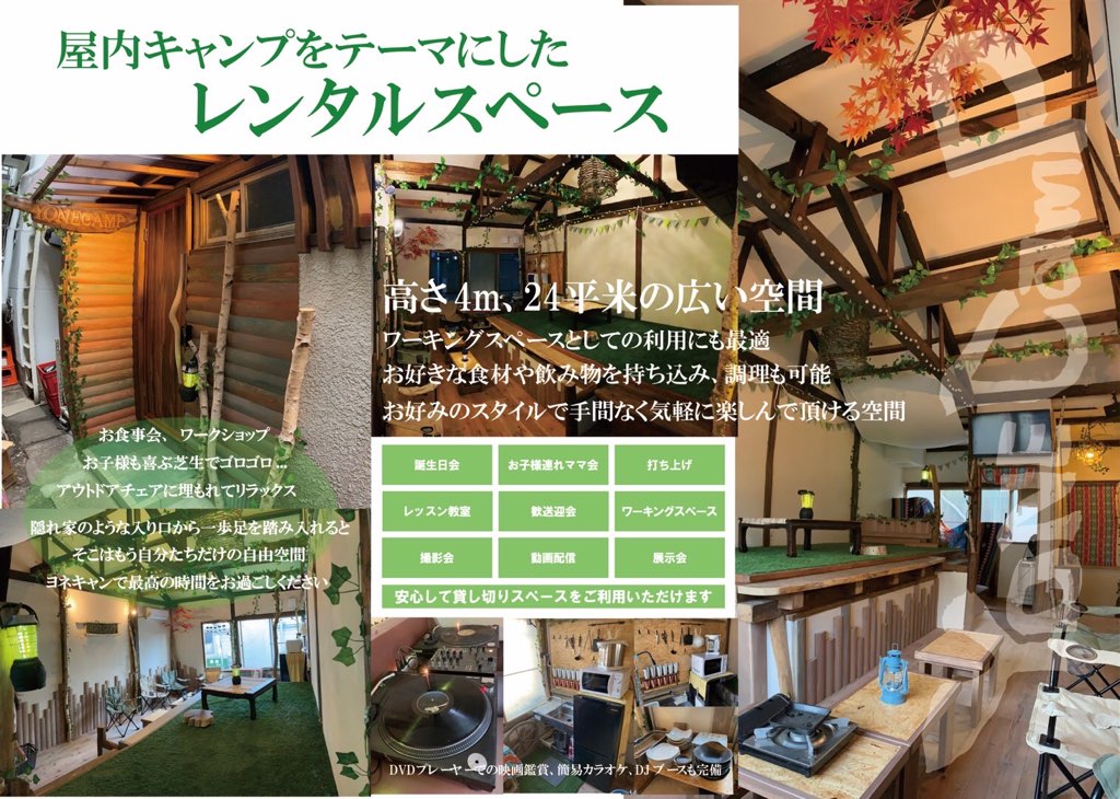 2階はキャンプをテーマに芝生やアウトドアチェアがあるレンタルスペースです。簡易カラオケやDJブースあり。