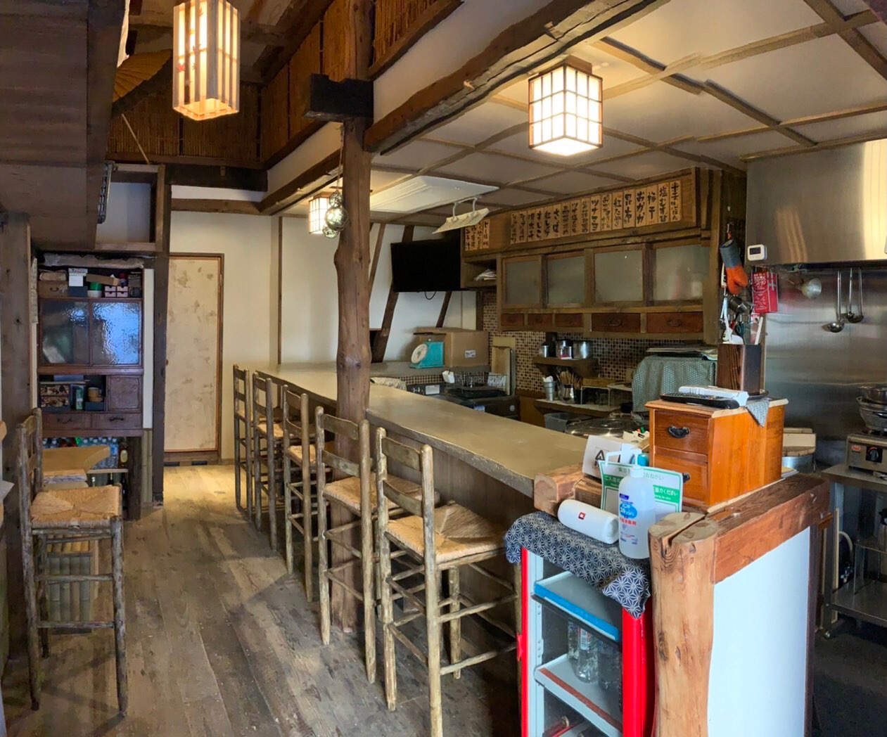 1階は全て手作りの古民家風の雰囲気のある渋いつくりで、普段はおにぎり屋、夜は居酒屋を営んでます。