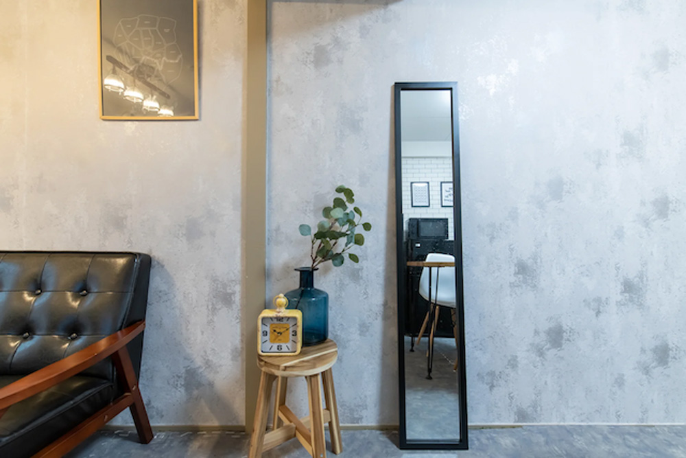 色味を落としたジャーナルスタンダードの壁紙に&コンクリートの壁がアクセント