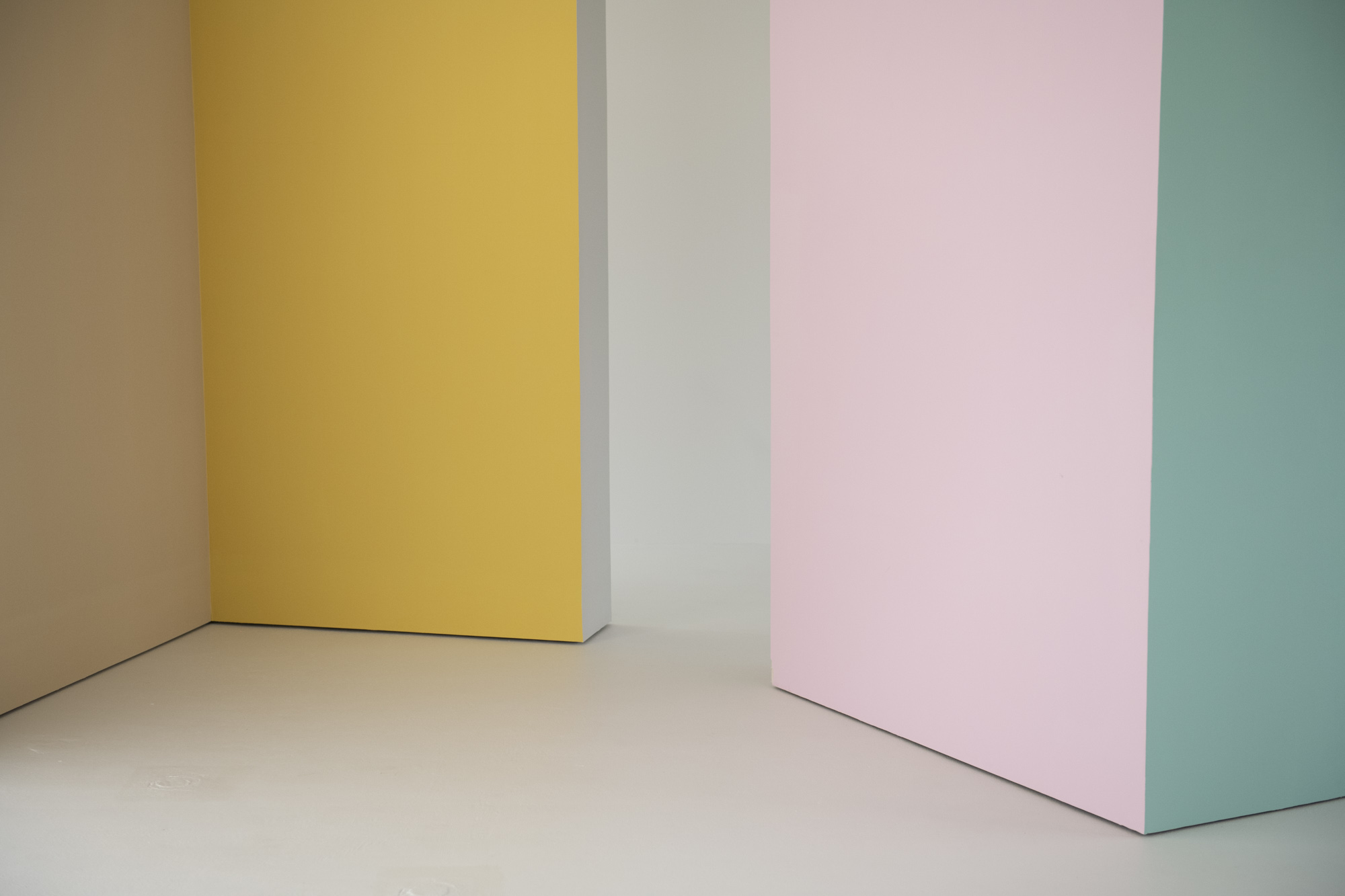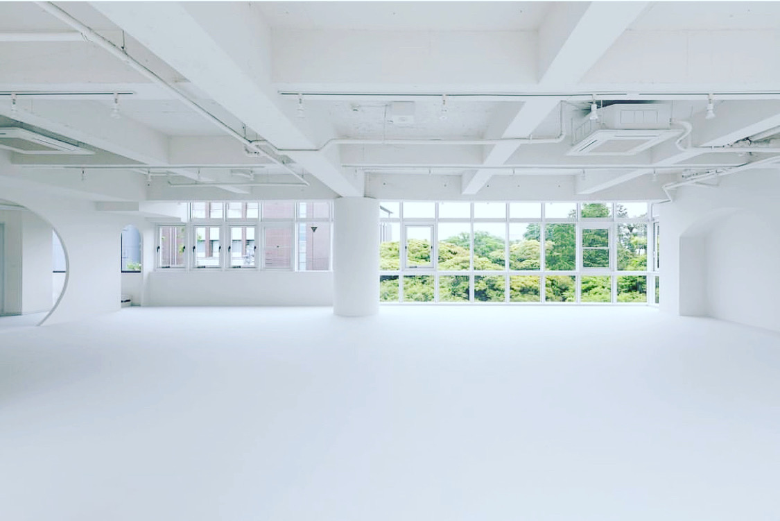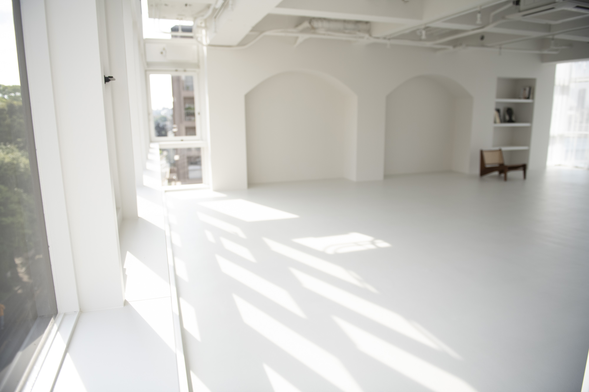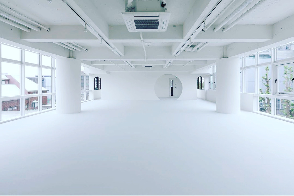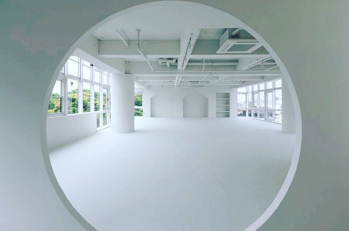 様々な背景色の可動式壁やアーチの造作、円柱など、美術館を思わせるスタジオ。