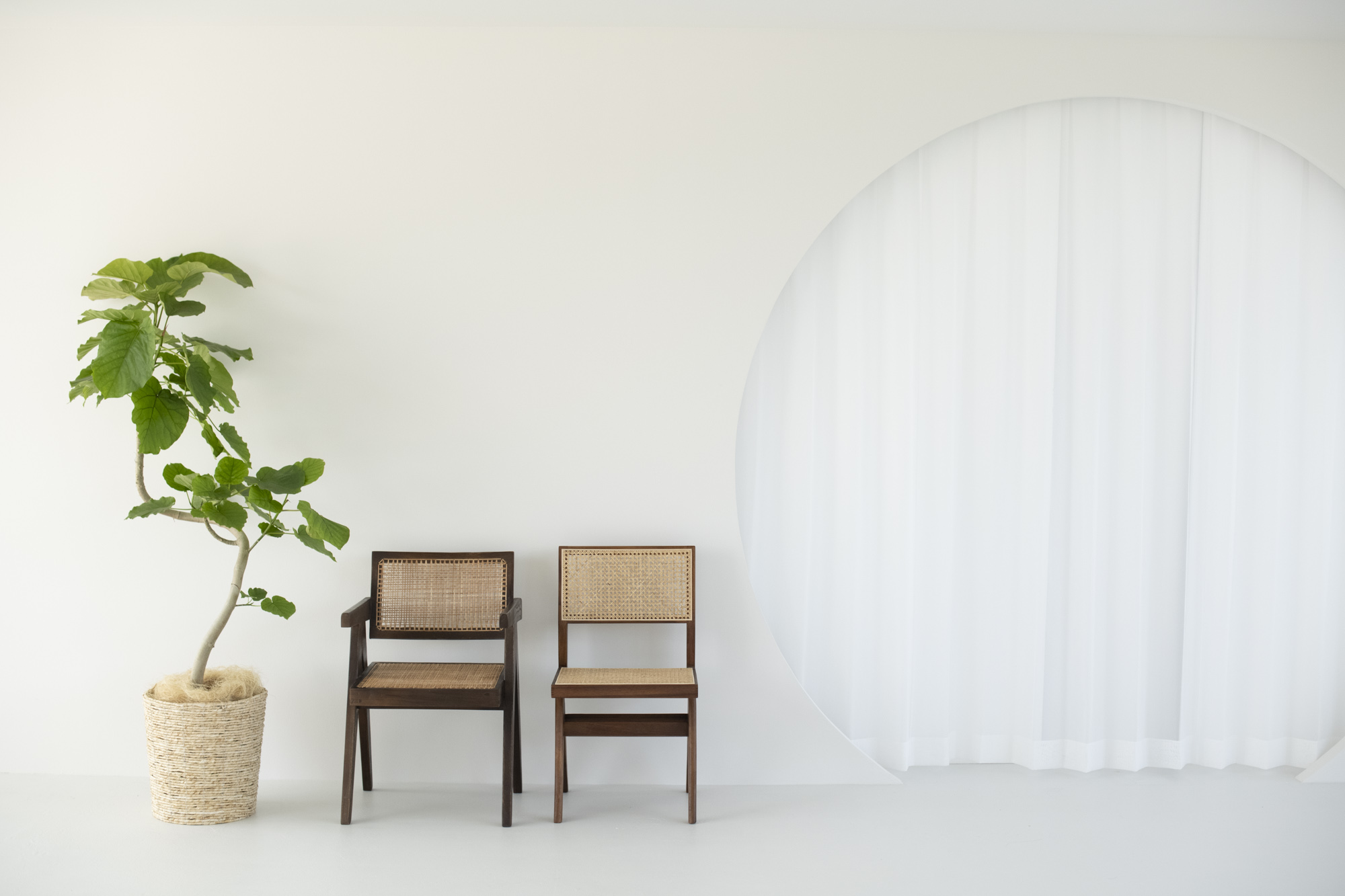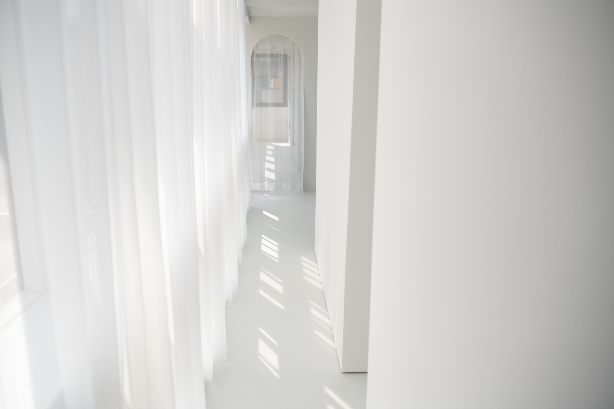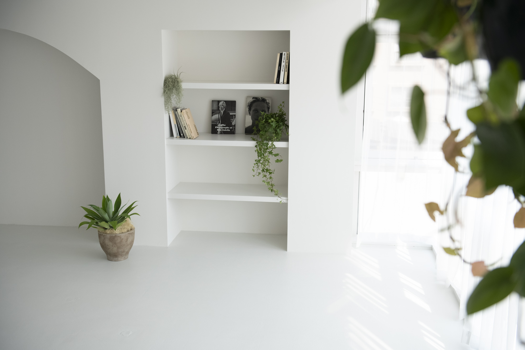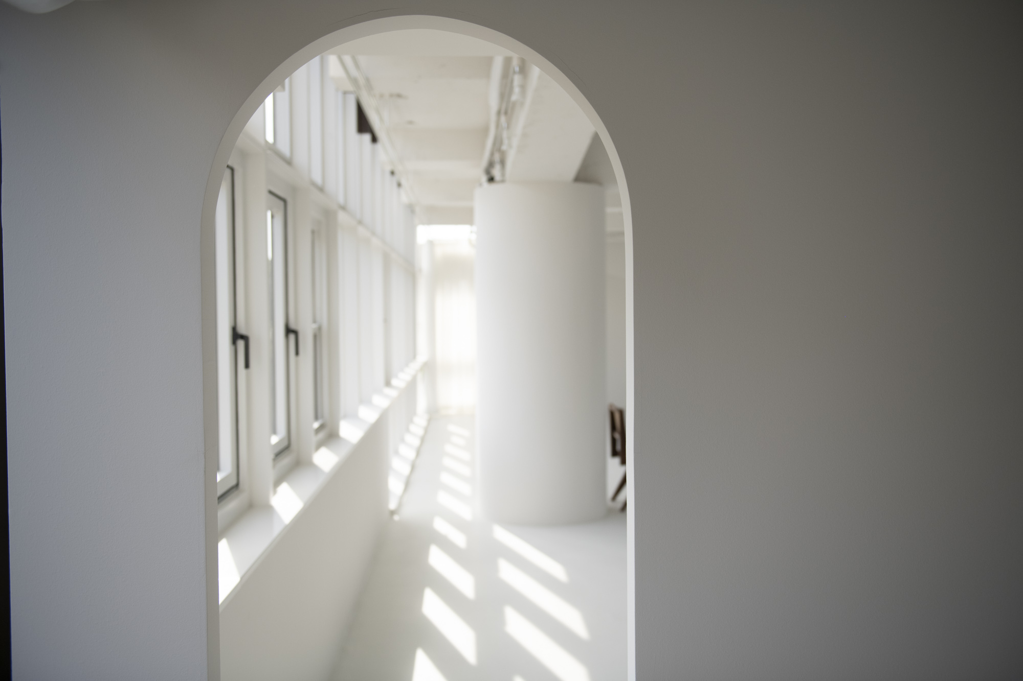 様々な背景色の可動式壁やアーチの造作、円柱など、美術館を思わせるスタジオ。
