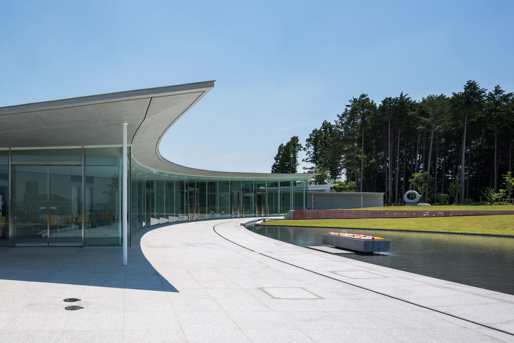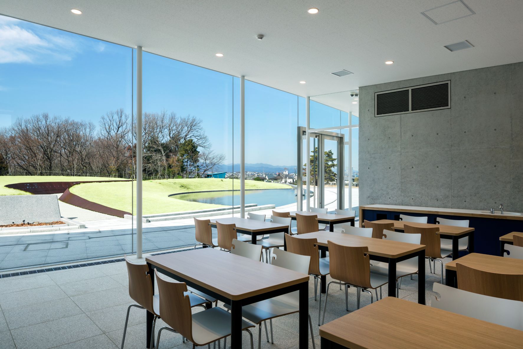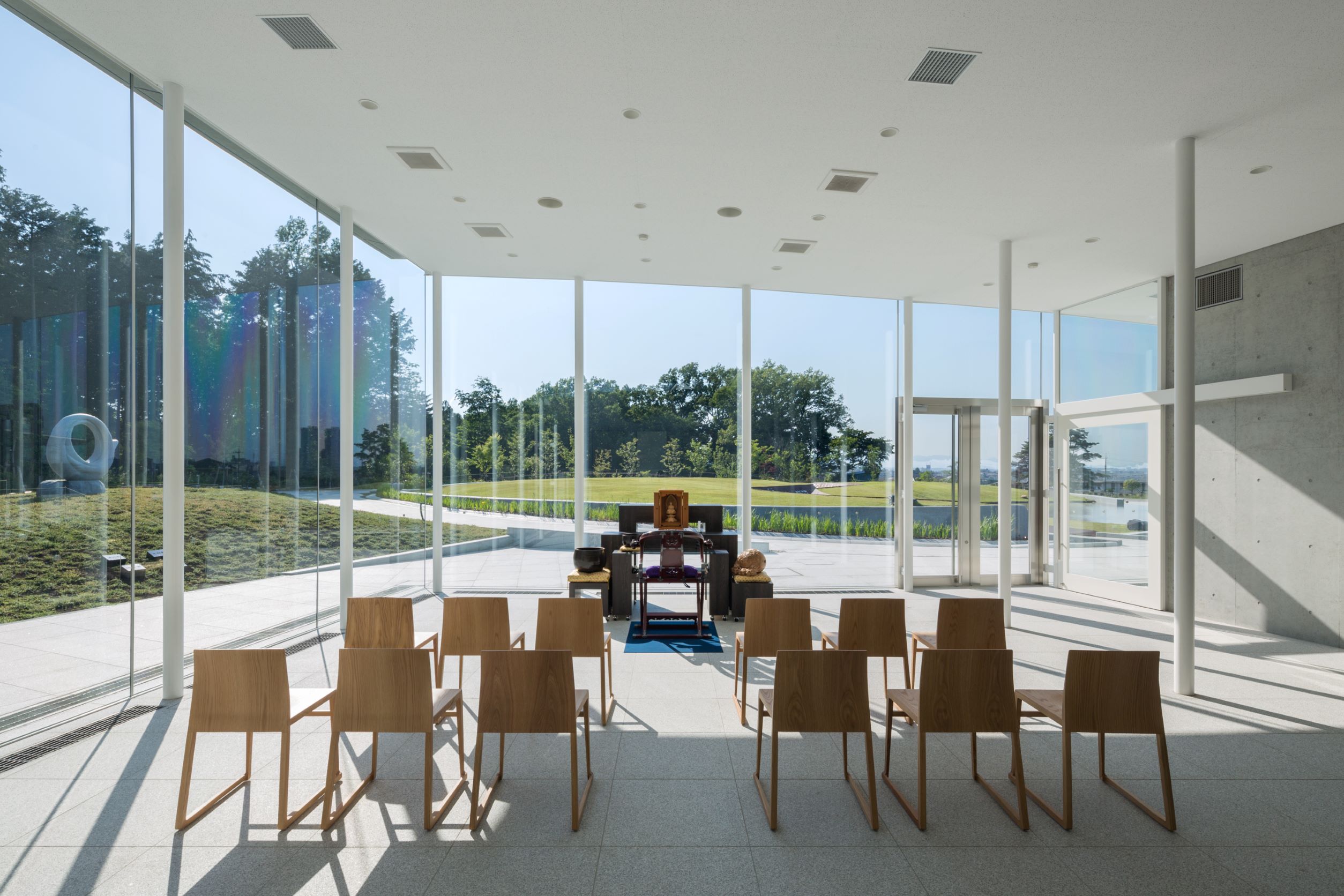 大法要室や休憩スペースがある建物はガラス張りになっていて、墓地全体が見渡せます。