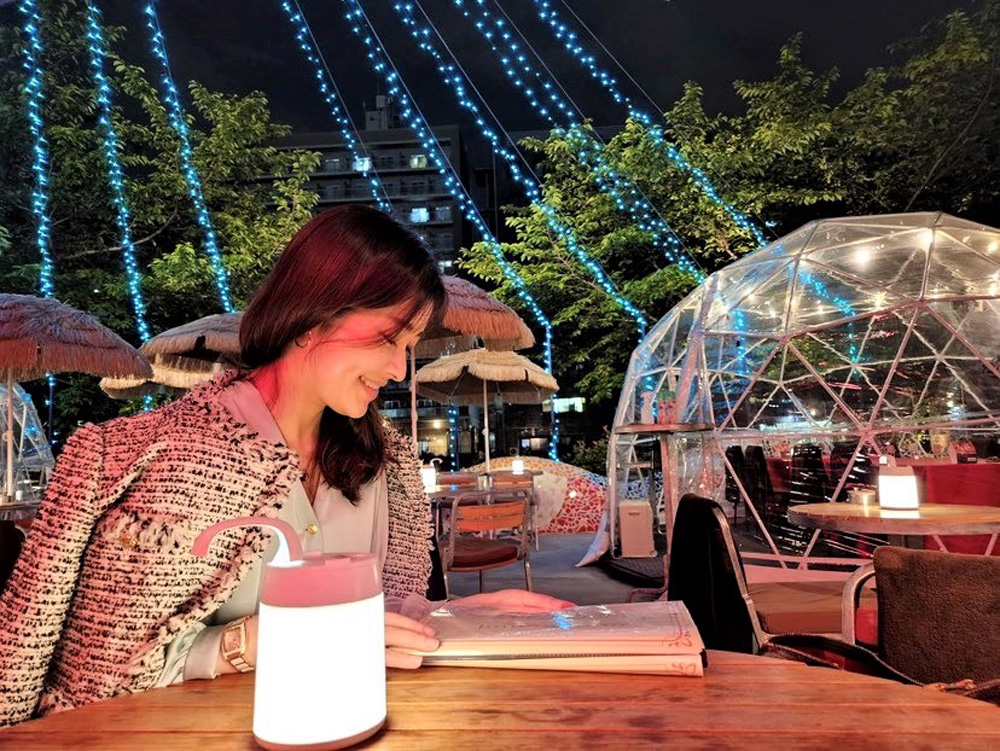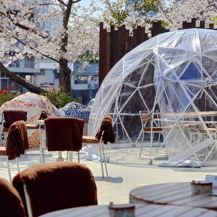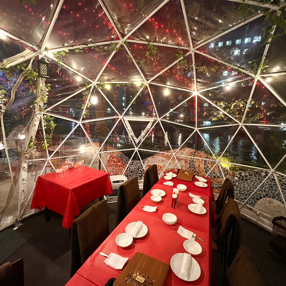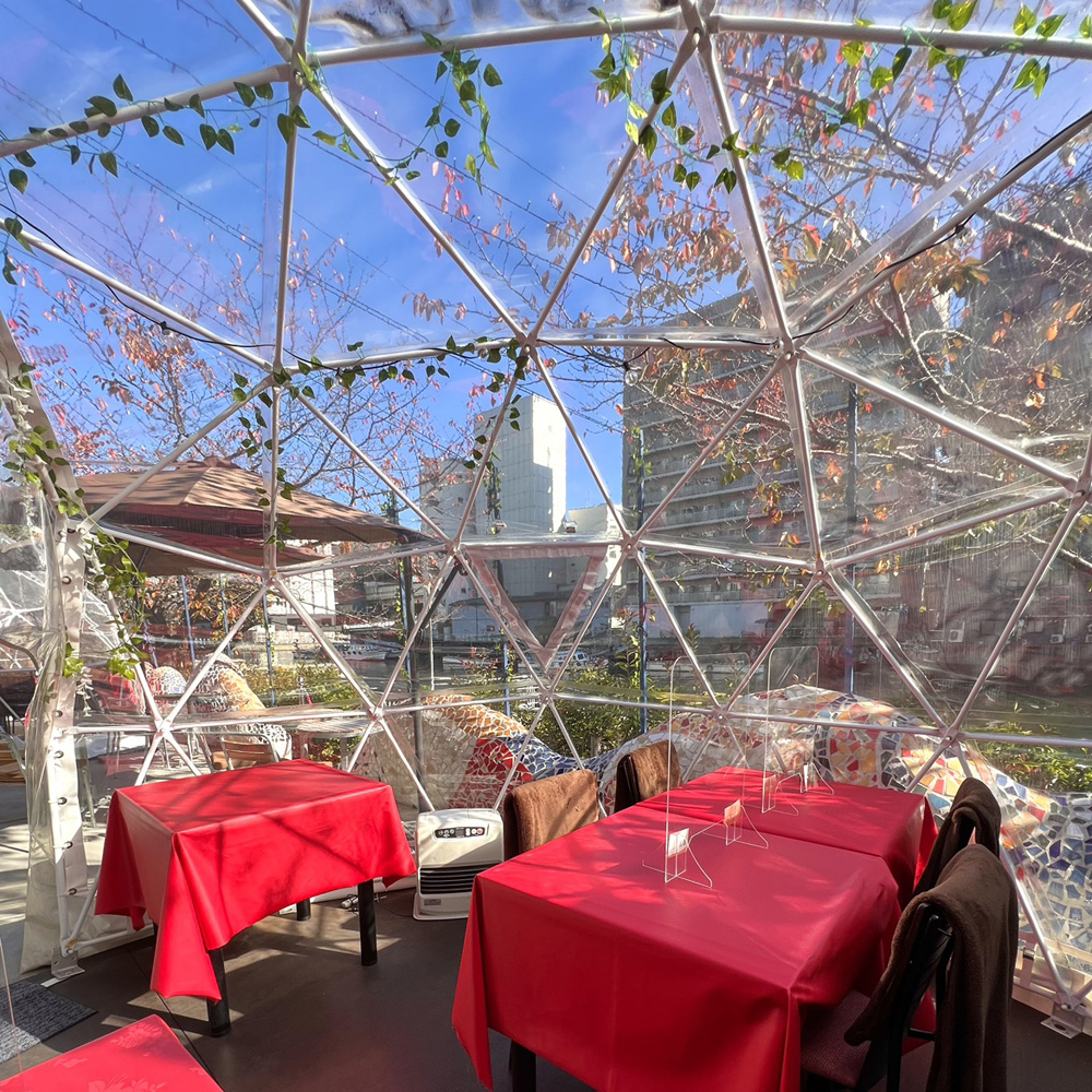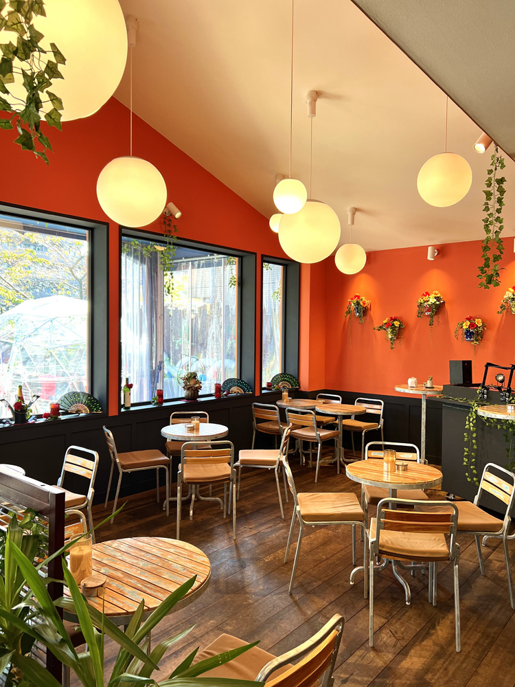 広々した水辺のテラスとフォトジェニックなドームテントが人気です。春には桜が咲き、お食事しながらお花見ができる素晴らしいロケーションです。オレンジを基調とした明るいインテリアで、お客様から「海外のリゾートにいるみたい」とのお声をいただきます。