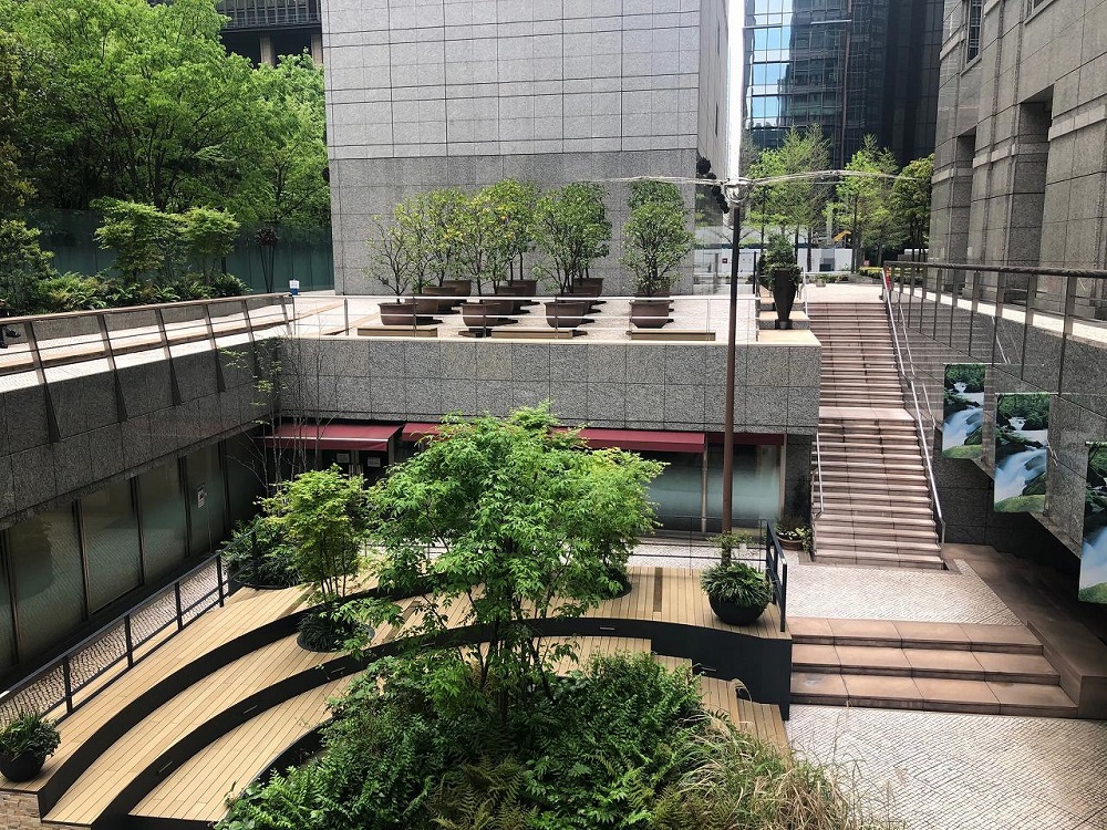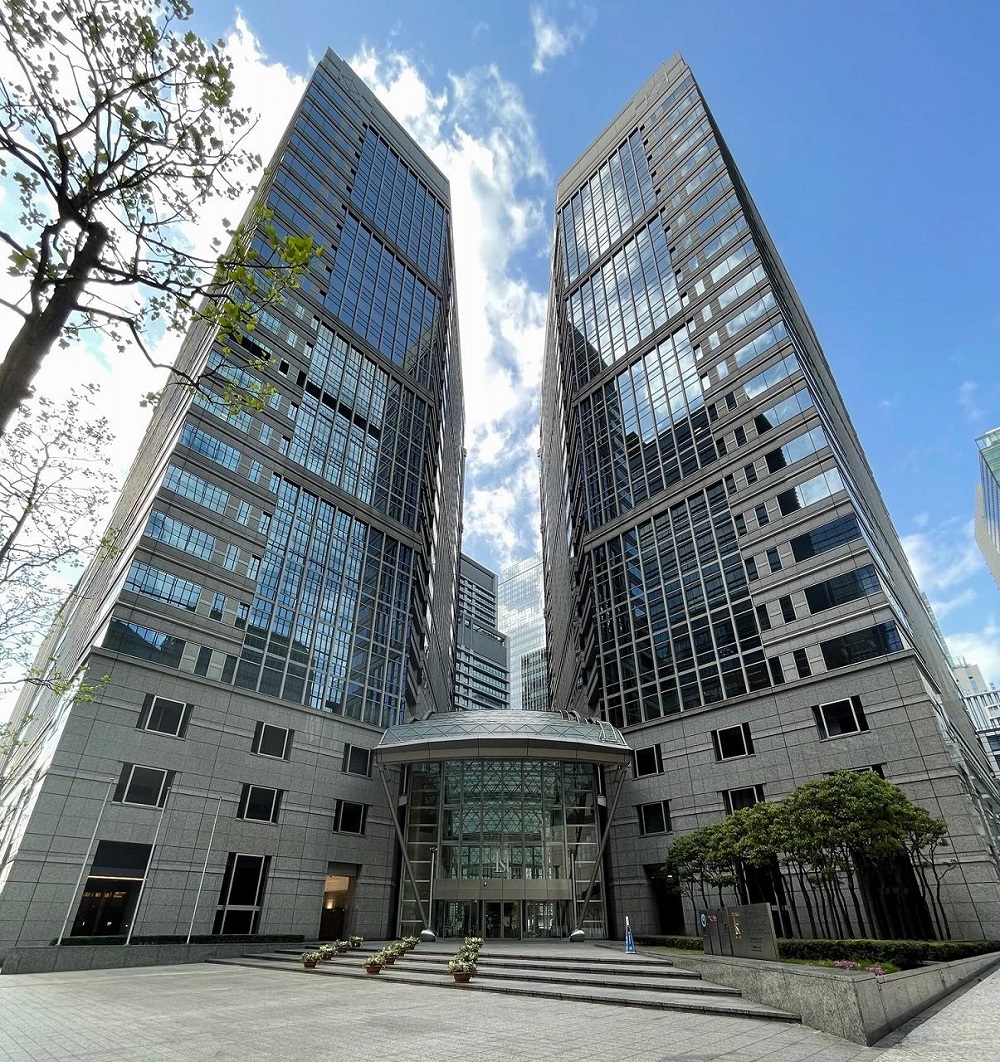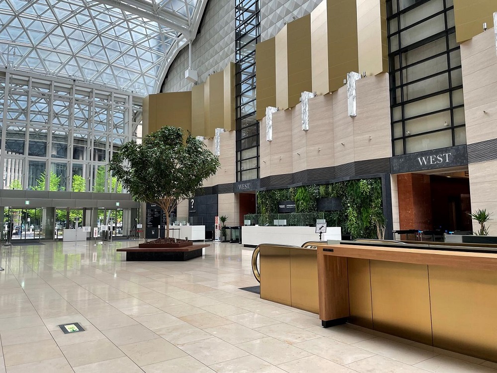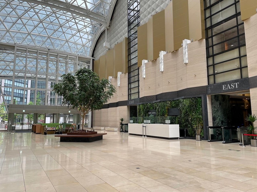 ガラス天井から陽の光が入る、ツインタワー間にあるアトリウムは令和3年にリニューアル。エントラス、オフィスロビー、EVホール、フラッパーゲート、カンファレンスセンター等オフィスシーンをまとめて撮影可能です。