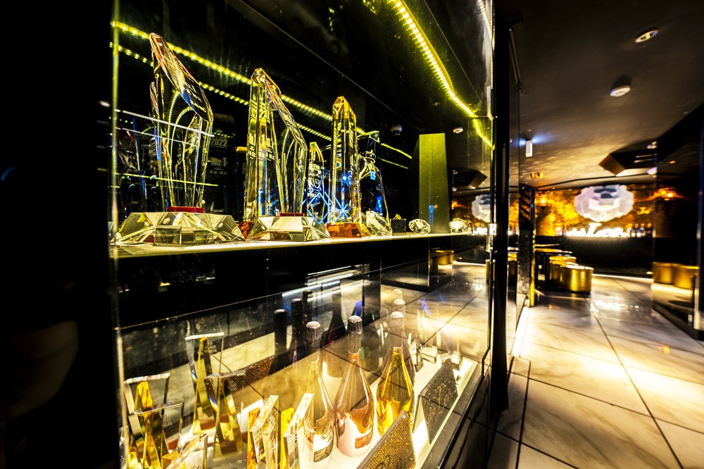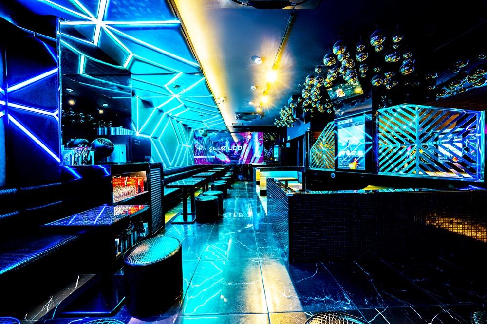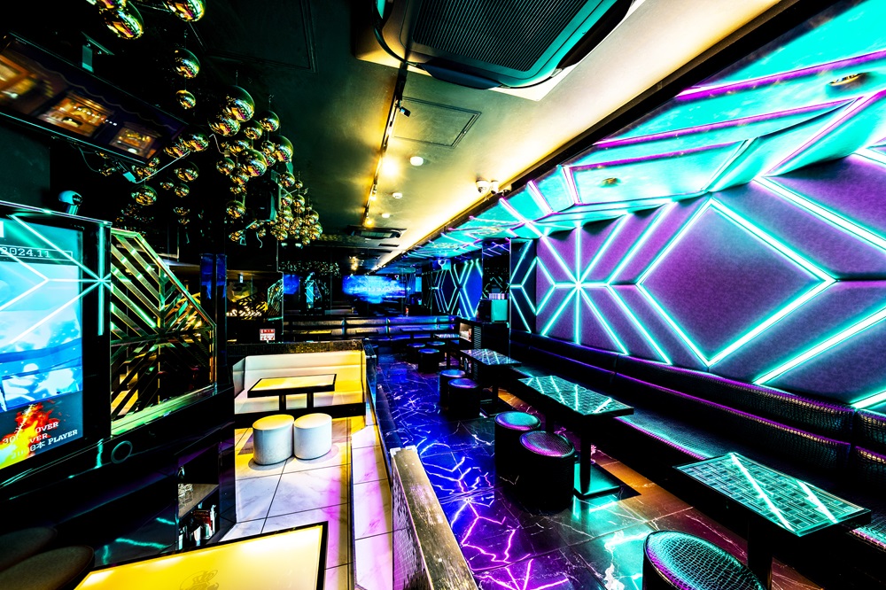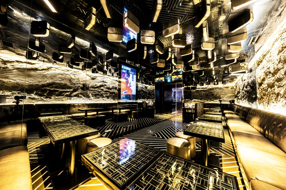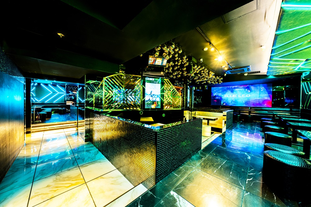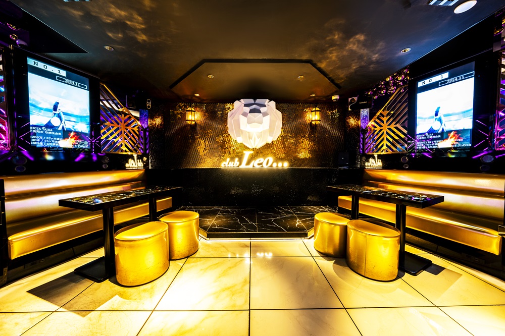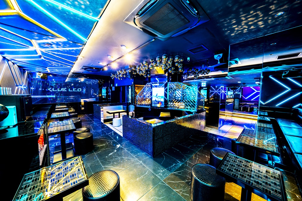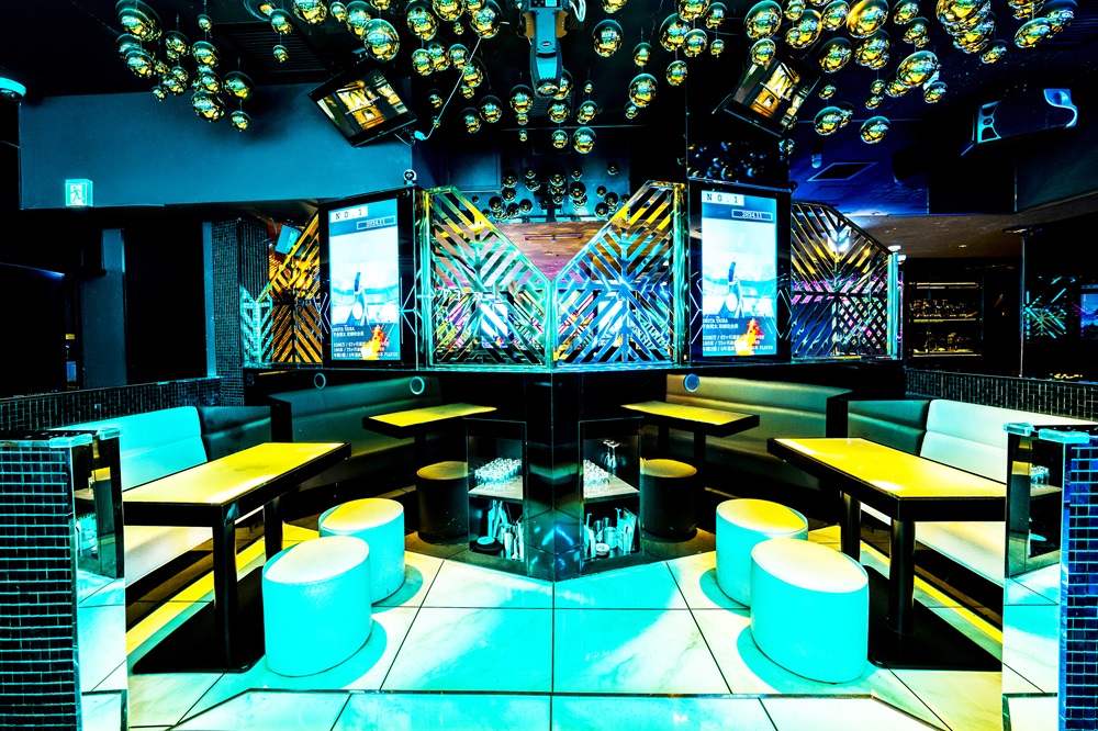 人気ホストのLEDモニターが飾られた階段から地下1Fへ降りると、メインとなるホールは黒に抑えられたゴールドが差し色の空間となっております。