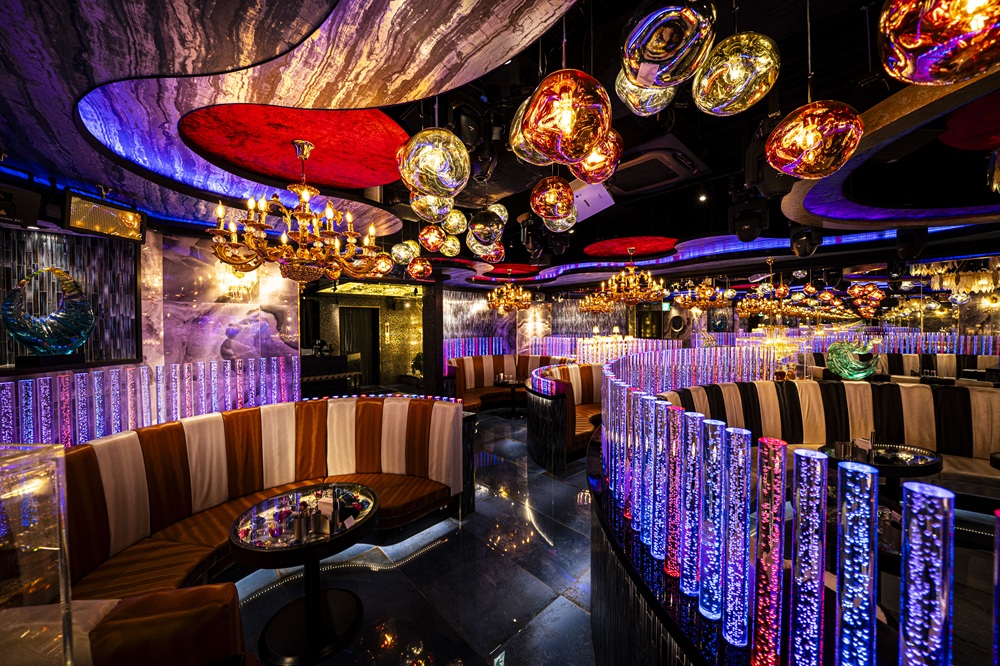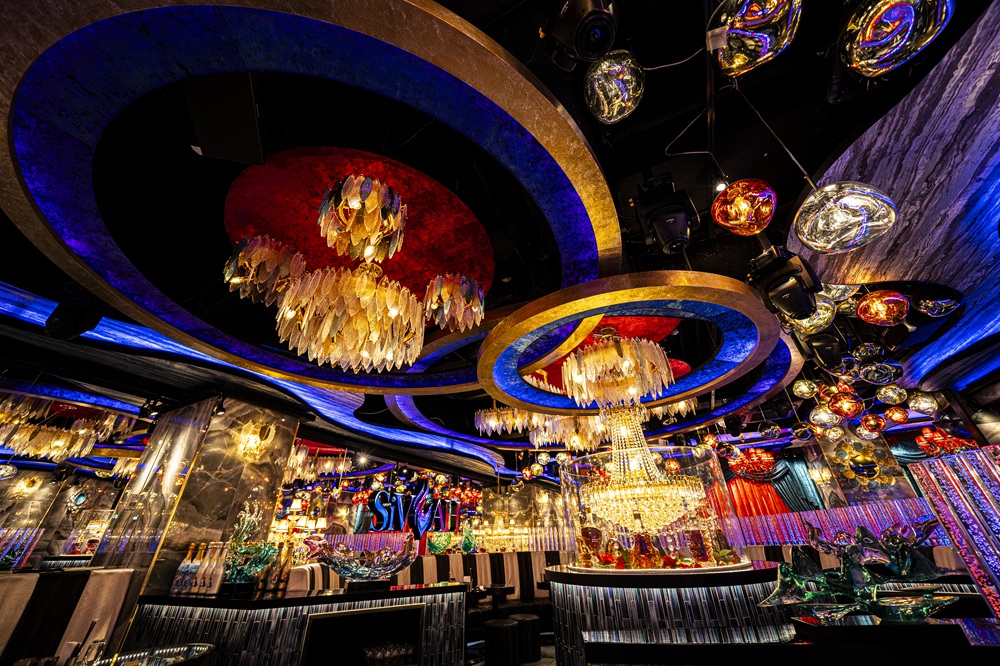 赤と青の光が“破壊と再生”を象徴する豪華な内装。