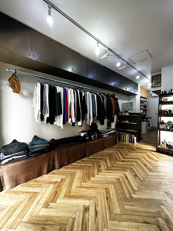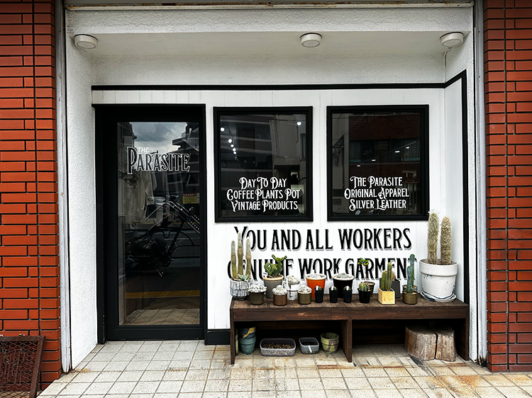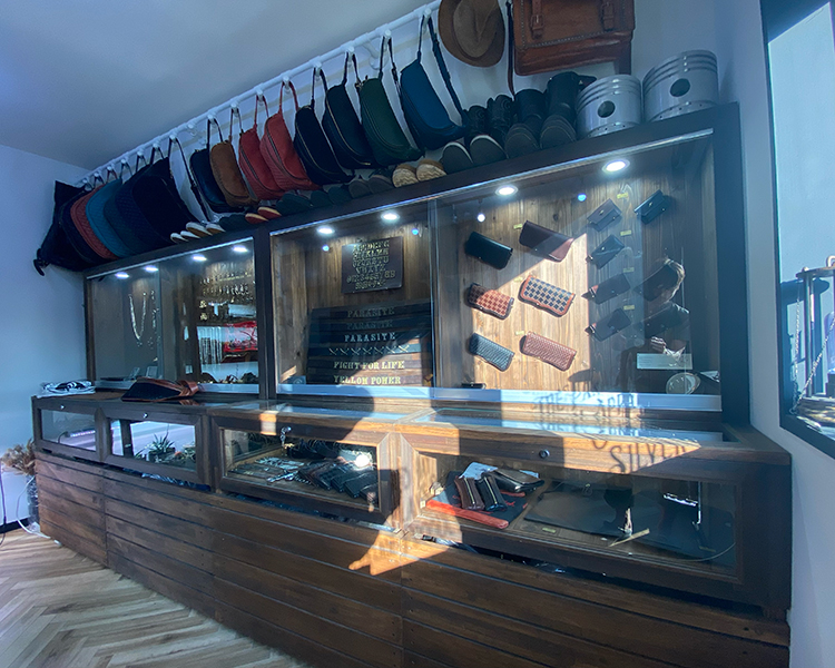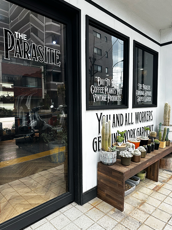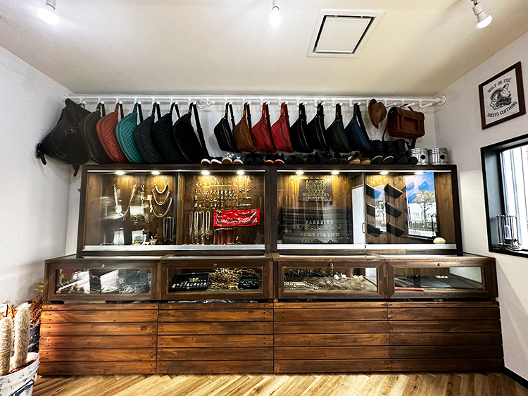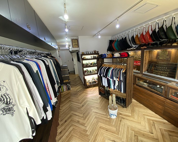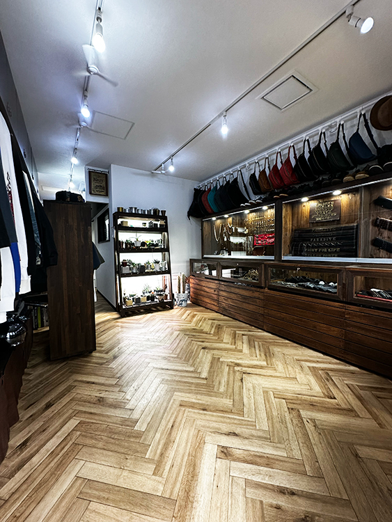モノトーンを基調とした売り場には、独自ブランドの商品が所狭しと陳列。シルバーアクセサリー、レザーバッグを中心とした革製品、トップスからボトムスまで取り揃えたアパレル。ヘラ絞りの伝統技術を駆使して造られた植物用鉢とそれに植えられたサボテン達。店内後方にはコーヒ提供用のカウンターも配備(店内スペースには椅子テーブルはありません)。さらにはアクセサリー工房も併設しております。