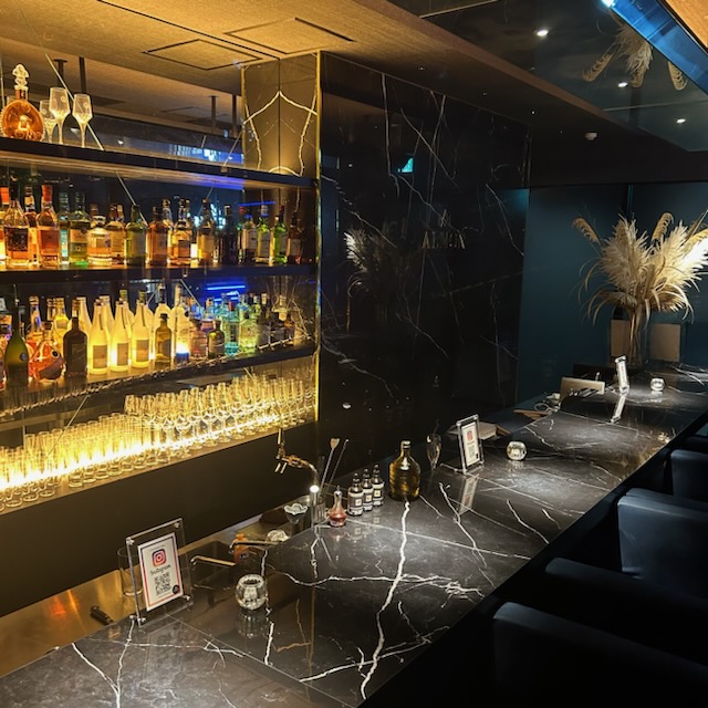 隠れ家的雰囲気が漂うバーの扉を開けると目に入るのは、限りなく照明を落とした空間に黒を貴重としたカウンター。華やかな装花が彩り、 西麻布の夜を演出する、洗練された空間です。カウンター、お席、個室が3部屋ございます。