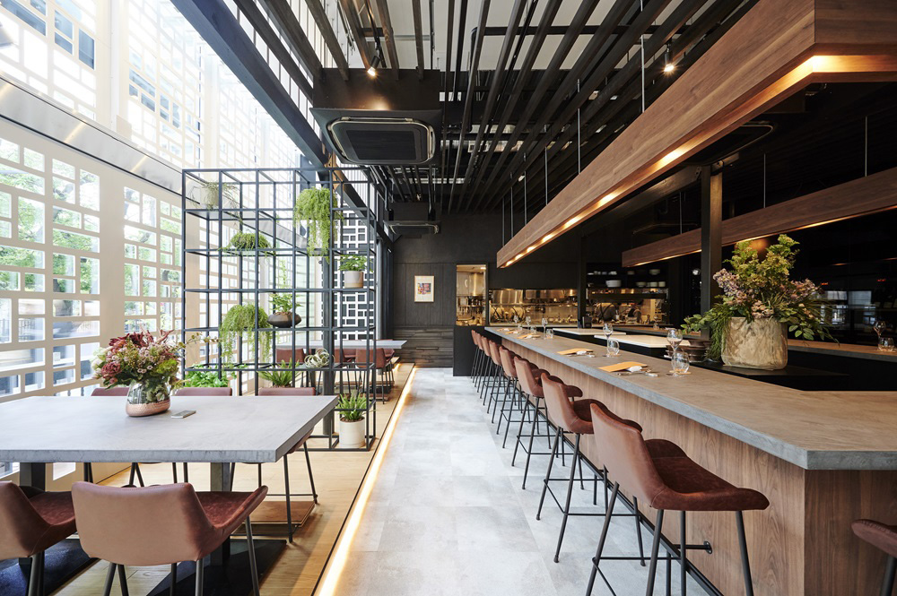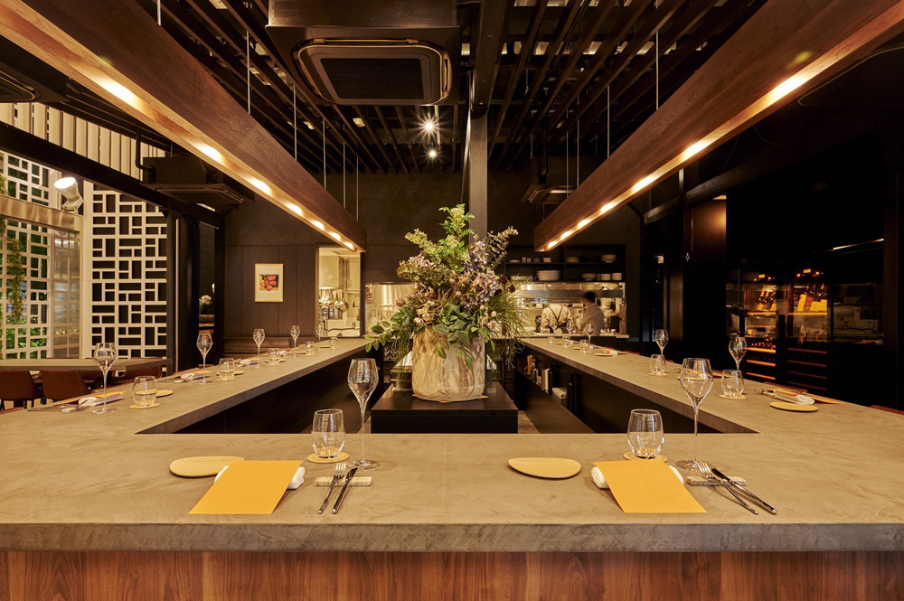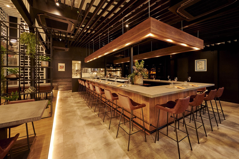 入り口扉を開けると目の前にモダンかつスタイリッシュなカウンター席が広がるカウンタースタイルフレンチレストランです。高い天井が広々とした空間を演出します。