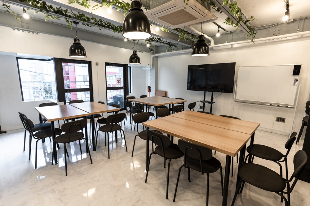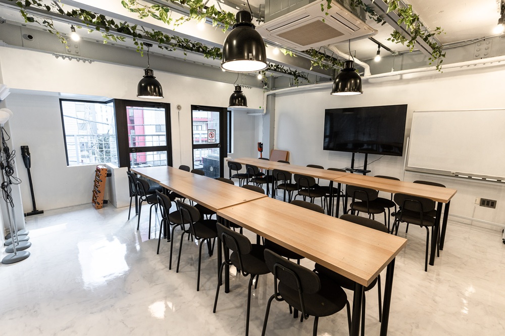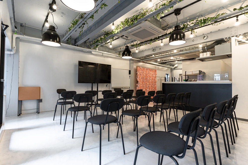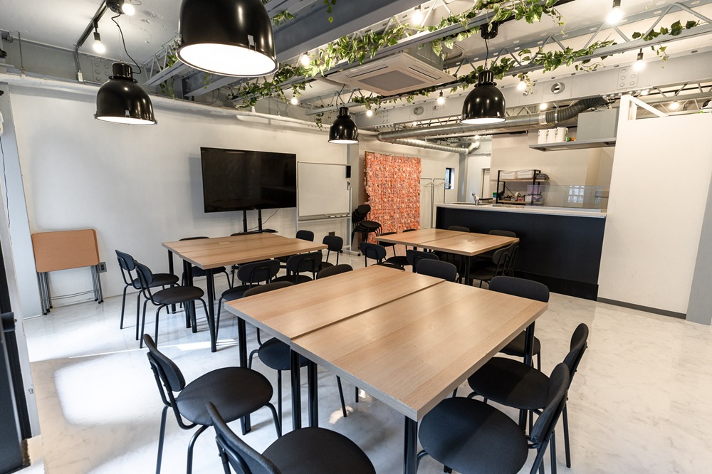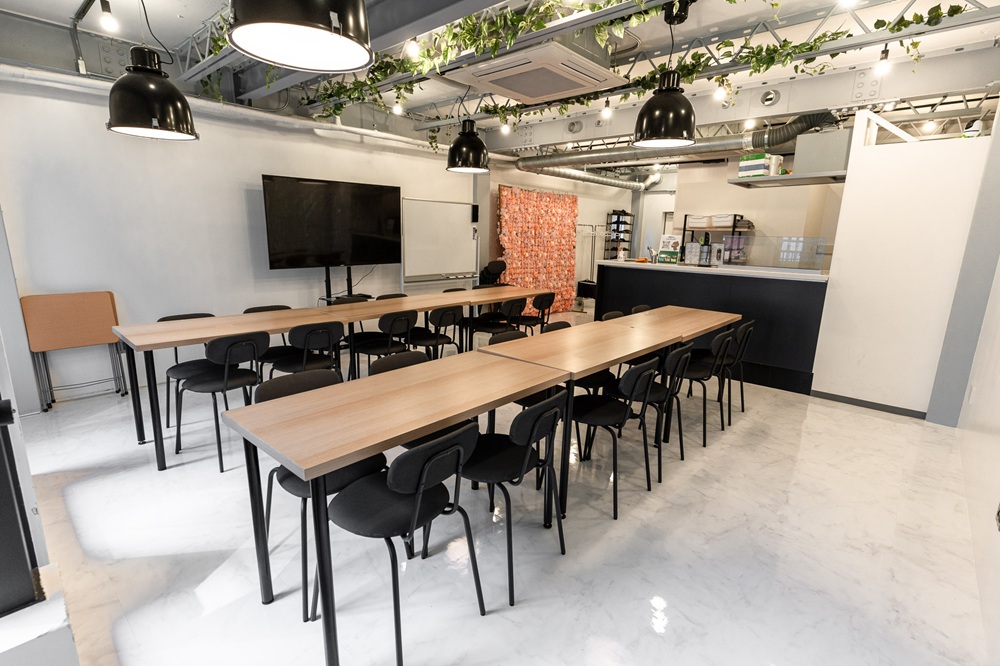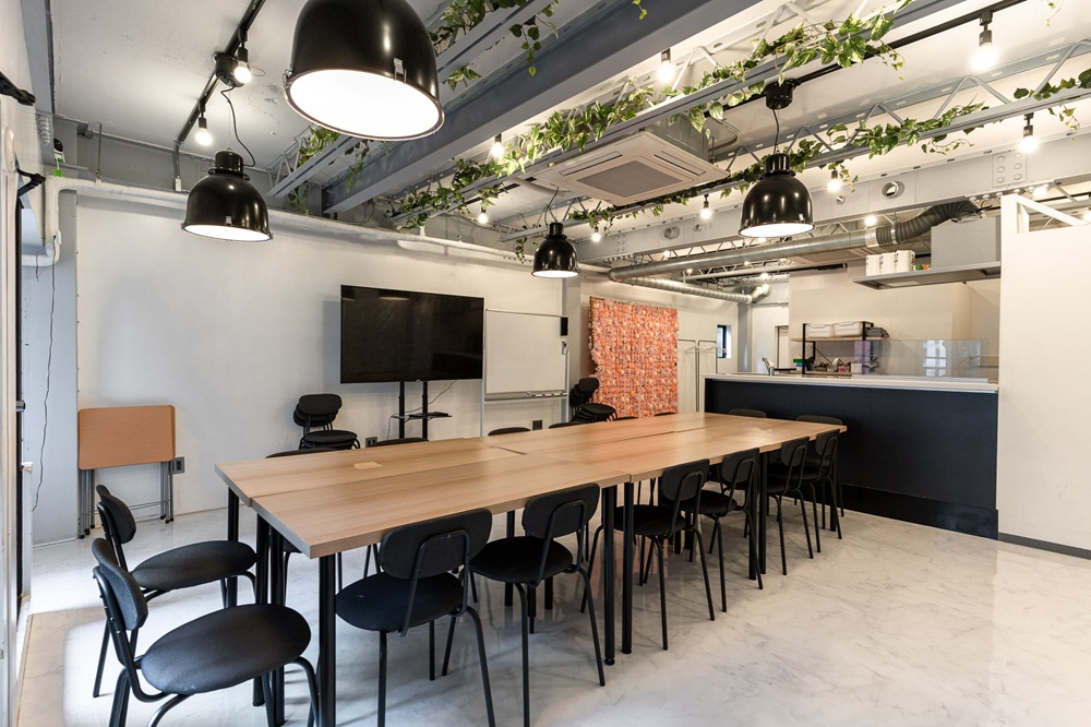 カウンターキッチン(IHコンロ)付きのシェアキッチンスペースで、最大30名の収容、28名の着座が可能です。