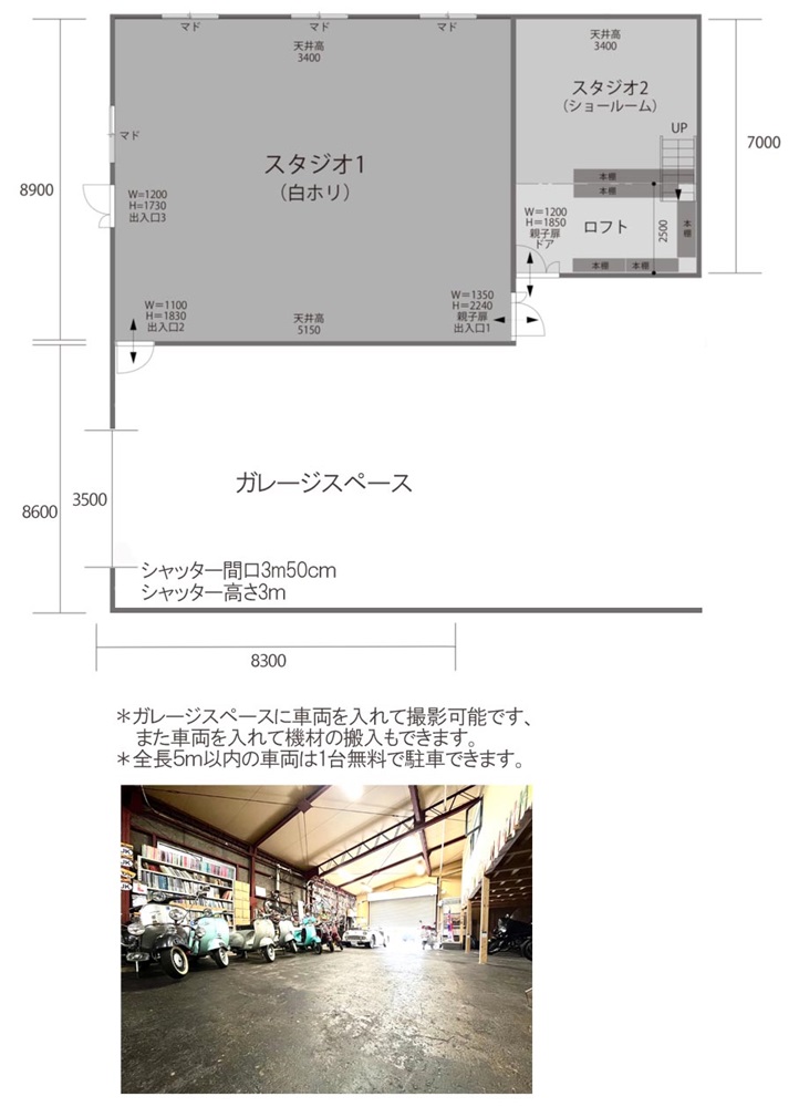 イギリスヴィンテージショップ内にオープンした撮影スタジオです。練馬区貫井の目白通りから少し入った静かな場所に位置し、広い白ホリスタジオとヴィンテージ 風のショールームの2部屋構成です。またヴインンテージバイクや自動車も撮影に利用可能です。