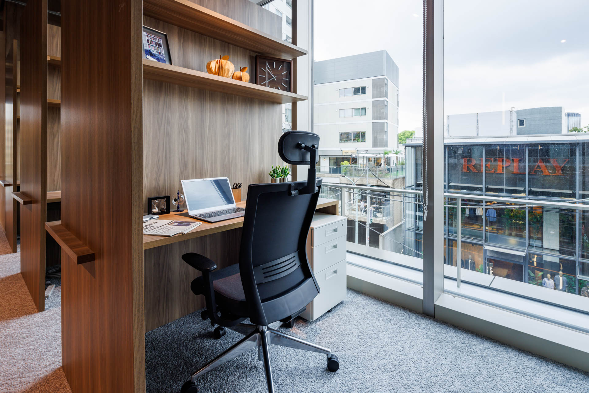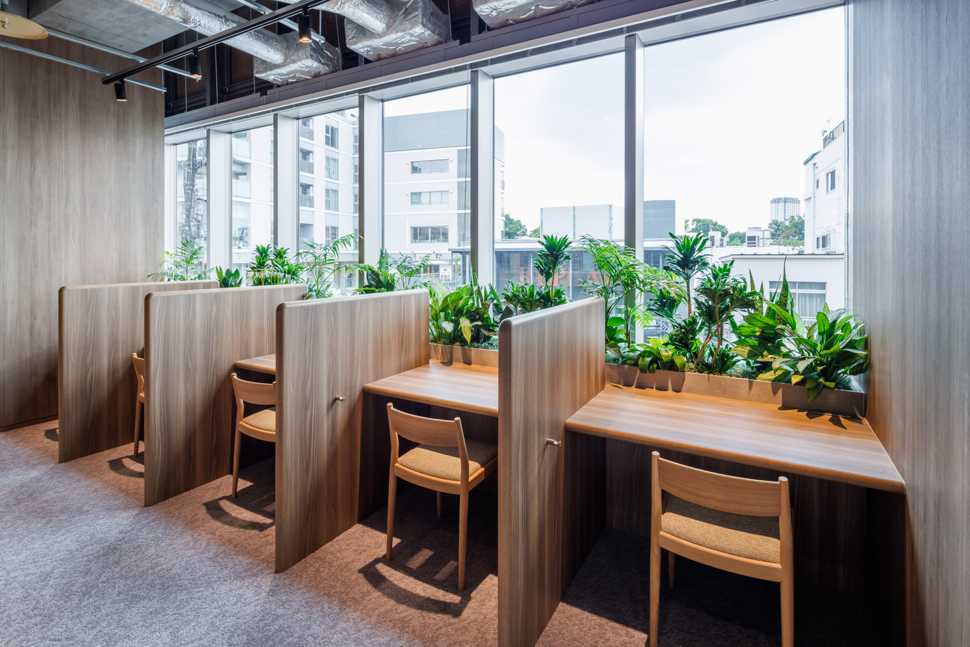 緑豊かな代官山の街並みを感じるワークスペースです。窓が大きく外の光が十分に入る構成が特徴で、広々とした空間をご利用いただけます。
