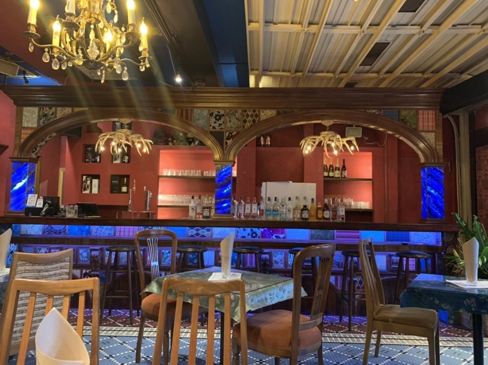 バーカウンター、ソファー、テーブルクロスの柄を全て合わせています。店内は広めで内装もゴージャスにしてあるのでまるで日本にいない雰囲気を味わえます。