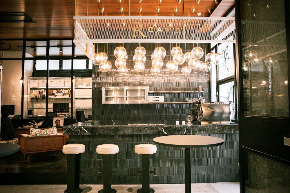 【 レンタルスペース&カフェ】 築33年の元倉庫。コンクリート打ちっ放しにミッドセンチュリーの名作家具がランダムに並ぶフロアは、Hotelのラウンジのような雰囲気を感じさせる。大理石やタイルで装飾されたcafeスペースやカウンターは重厚感がありつつもシックな印象。