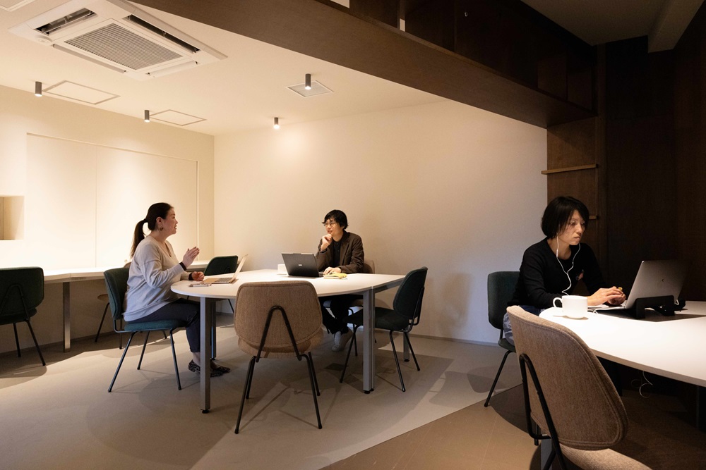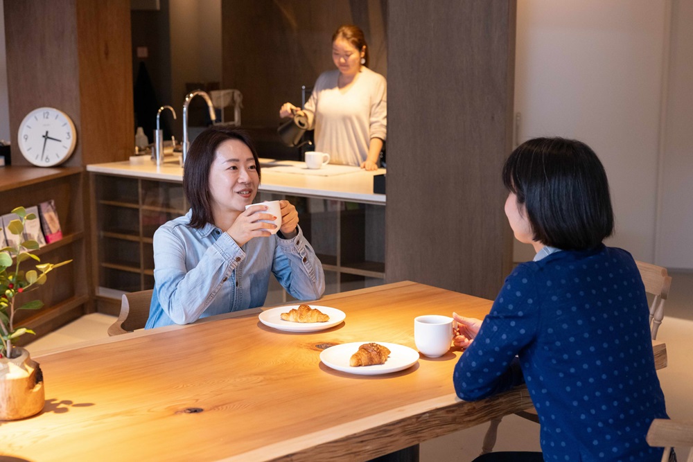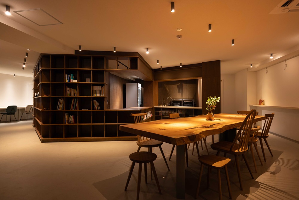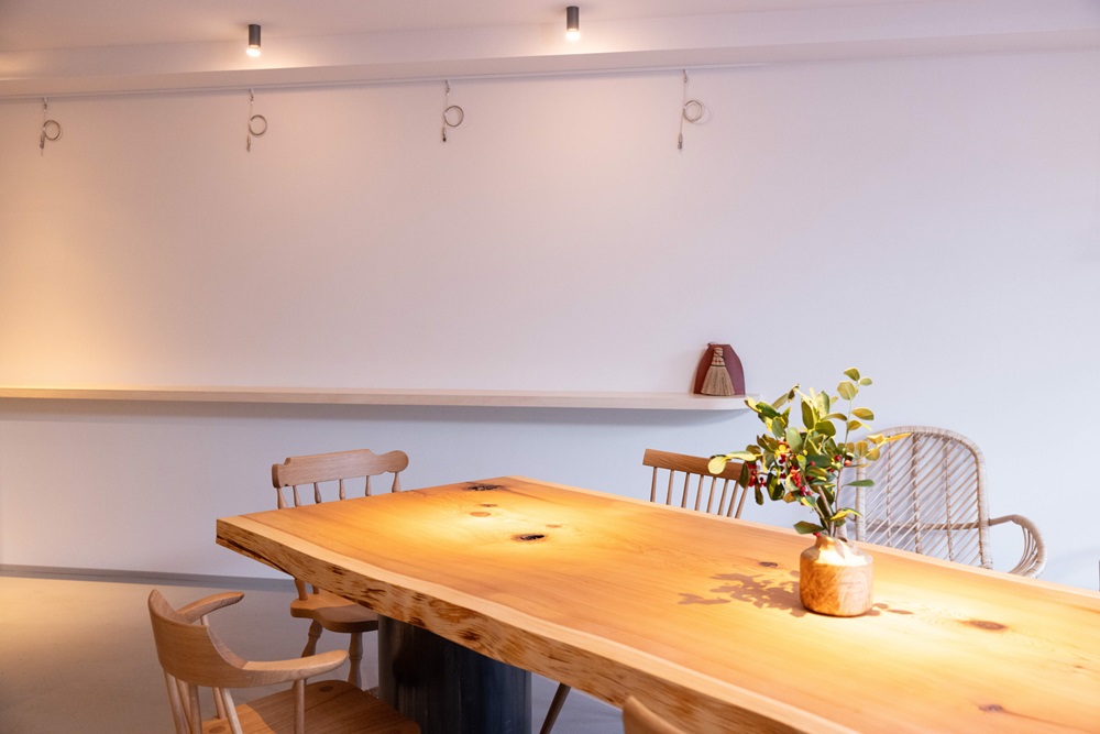 大きな1枚板のテーブルと、スペースの真ん中にある本棚が特徴的です。