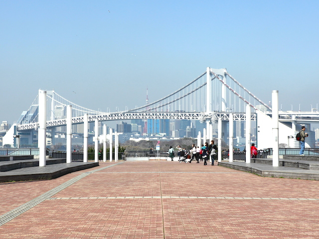 The location where Sergeant Sumire Onda (played by Eri Fukatsu) was shot by the felon is in the film "Bayside Shakedown 2 - International Version” (2003) is this “West Promenade” in Odaiba. You can enjoy the liberating view of the Rainbow Bridge and Tokyo Tower from the street that extends toward the sea.