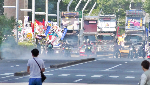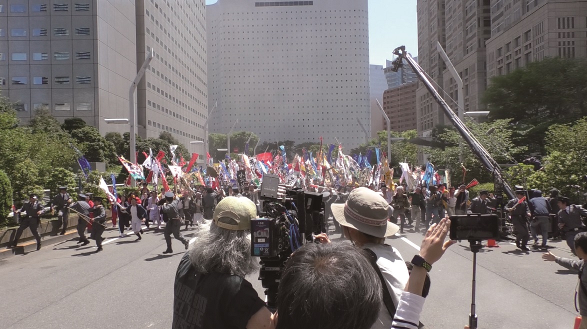 映画『翔んで埼玉』(2019)で❝隠れ埼玉県人❝麻実麗(GACKT)率いる埼玉解放戦線と❝壇ノ浦家執事❝阿久津翔(伊勢谷友介)率いる千葉解放戦線が連合軍となって都庁に攻め入るシーンは、ここ都庁通りで撮影されました。3日間にわたって道路を封鎖して、のべ1000人を超えるエキストラが解放戦線のメンバーや機動隊、報道カメラマンなど様々な扮装で参加しました。