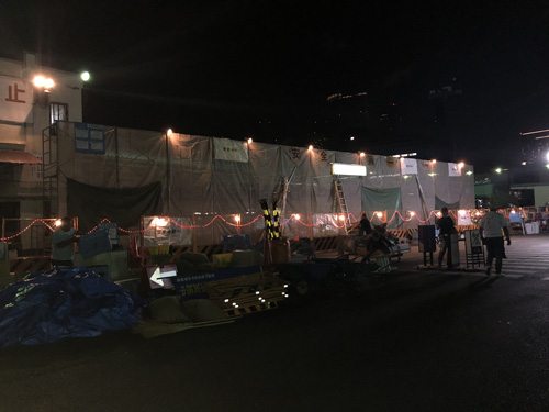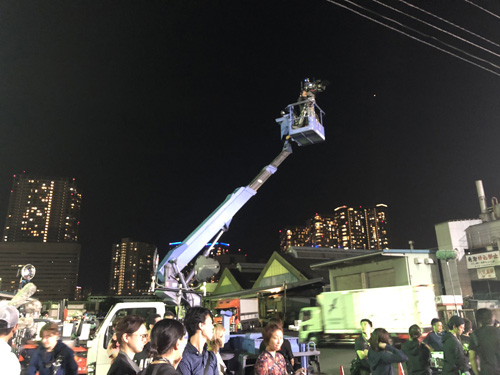 移転を控えた築地市場での最後の撮影となりました。数時間かけて組み立てた鉄鋼セットにより、築地市場は巨大な工事現場へと変えられました。劇用車が到着し、夜の撮影がスタートしました。夜中まで続いた撮影でしたが、施設管理者の方、築地市場で働く方々のご協力により無事に撮影完了しました。