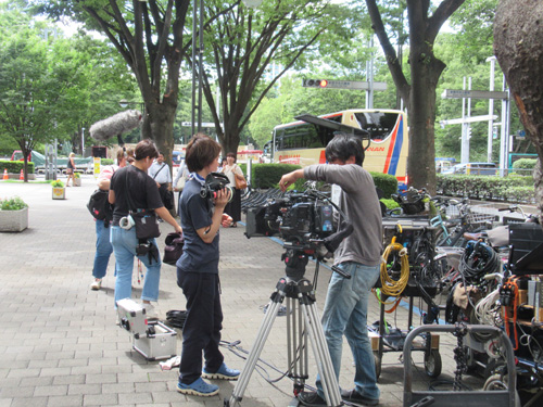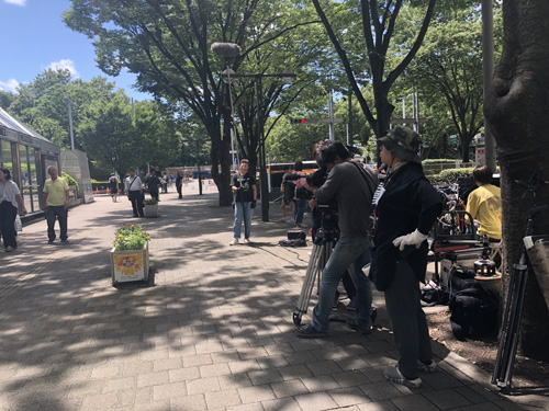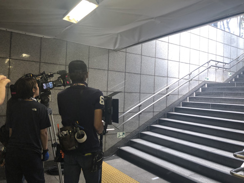 撮影の数時間前に急な雨が降り、天気の心配がありましたが、撮影中は雨が降ることもなく、カンカン照りの中、撮影が行われました。4カットの撮影でしたが、スムーズに準備と撮影が繰り返され、駅利用者の方にもご協力をいただいたことで、予定より1時間早く撮影を終えることが出来ました。急に階段に現れたキャストの遠藤憲一さんに、「頑張ってください。大好きです!」という声援が飛び、利用者の声援にお礼を言うシーンもありました。ご協力ありがとうございました。
